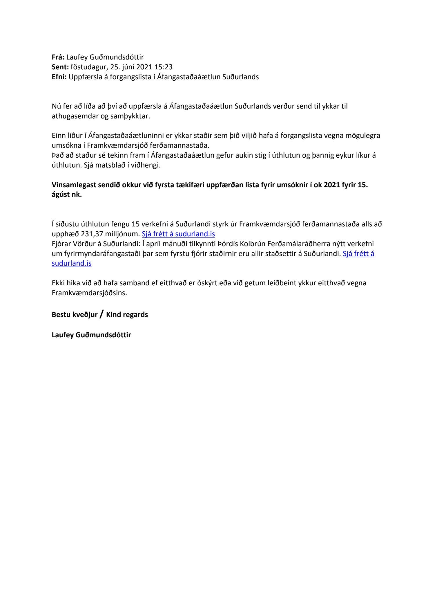 Erindi frá Markaðsstofu Suðurlands, dags. 25. júní, um Áfangastaðaáætlun Suðurlands, þar var óskað eftir uppfærðum lista fyrir mögulegar umsóknir í Framkvæmdasjóð ferðamannastaða.