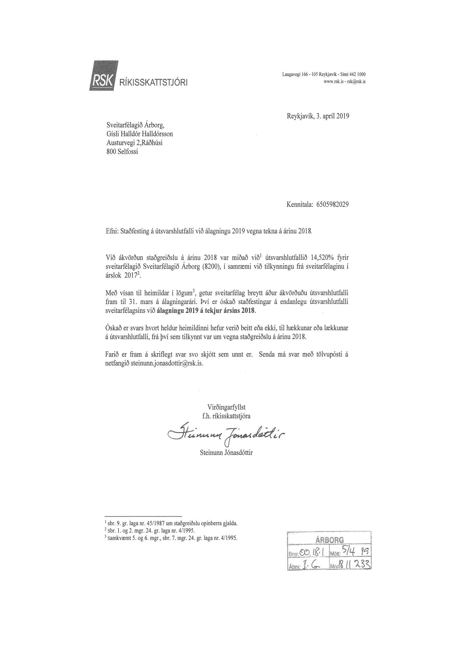 Erindi frá RSK, dags. 3. apríl, um staðfestingu á útsvarshlutfalli við álagningu 2019 vegna tekna á árinu 2018.