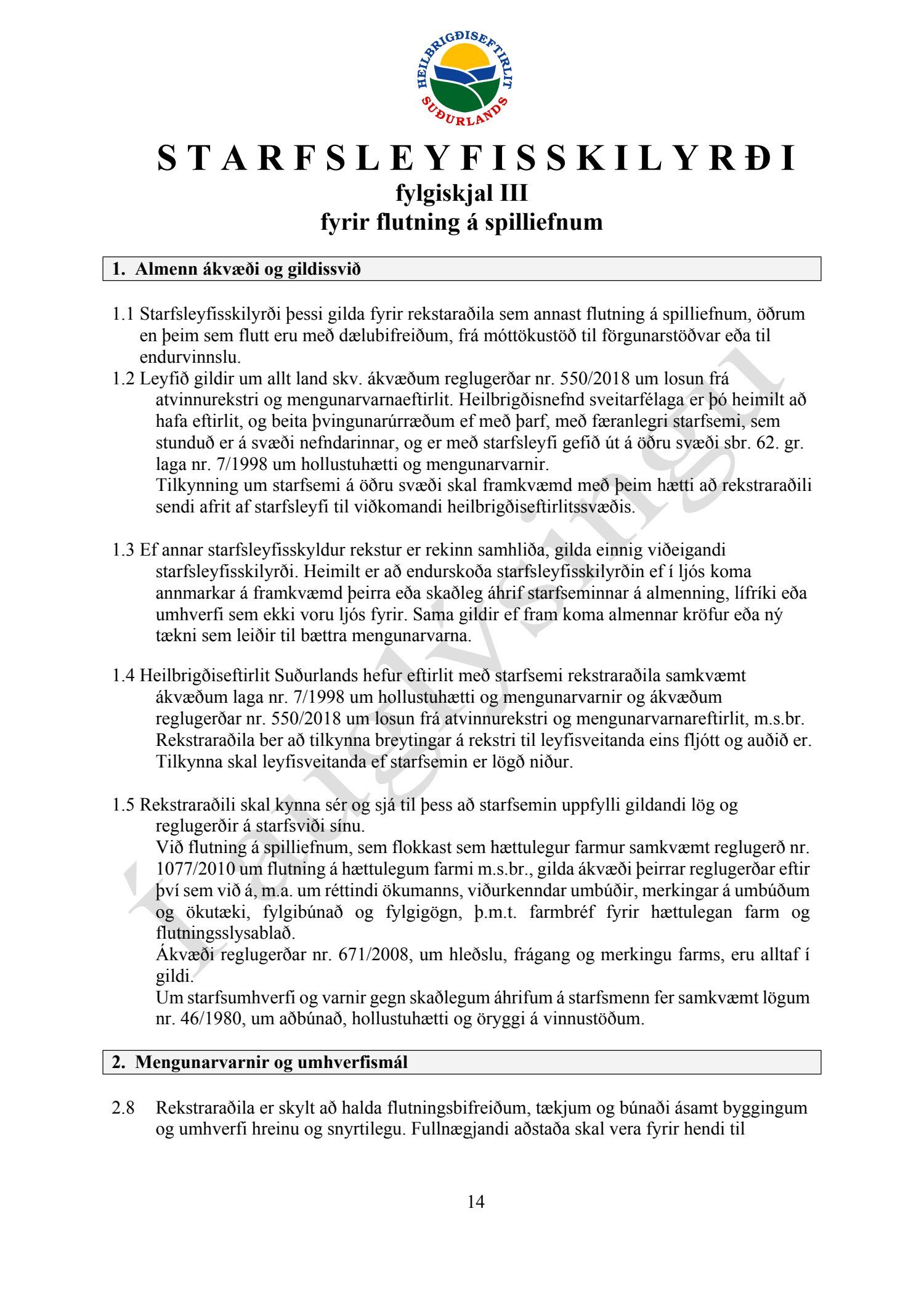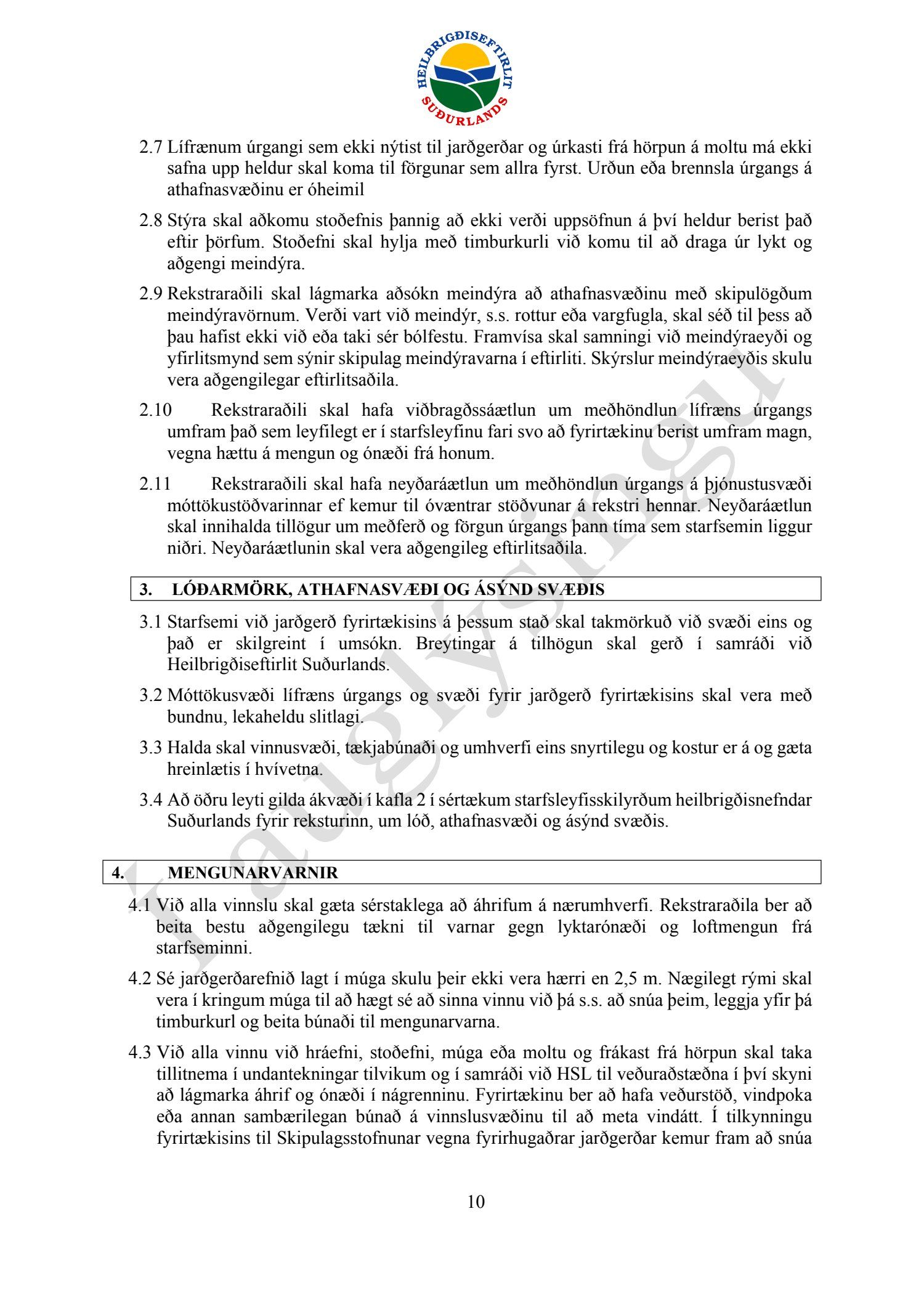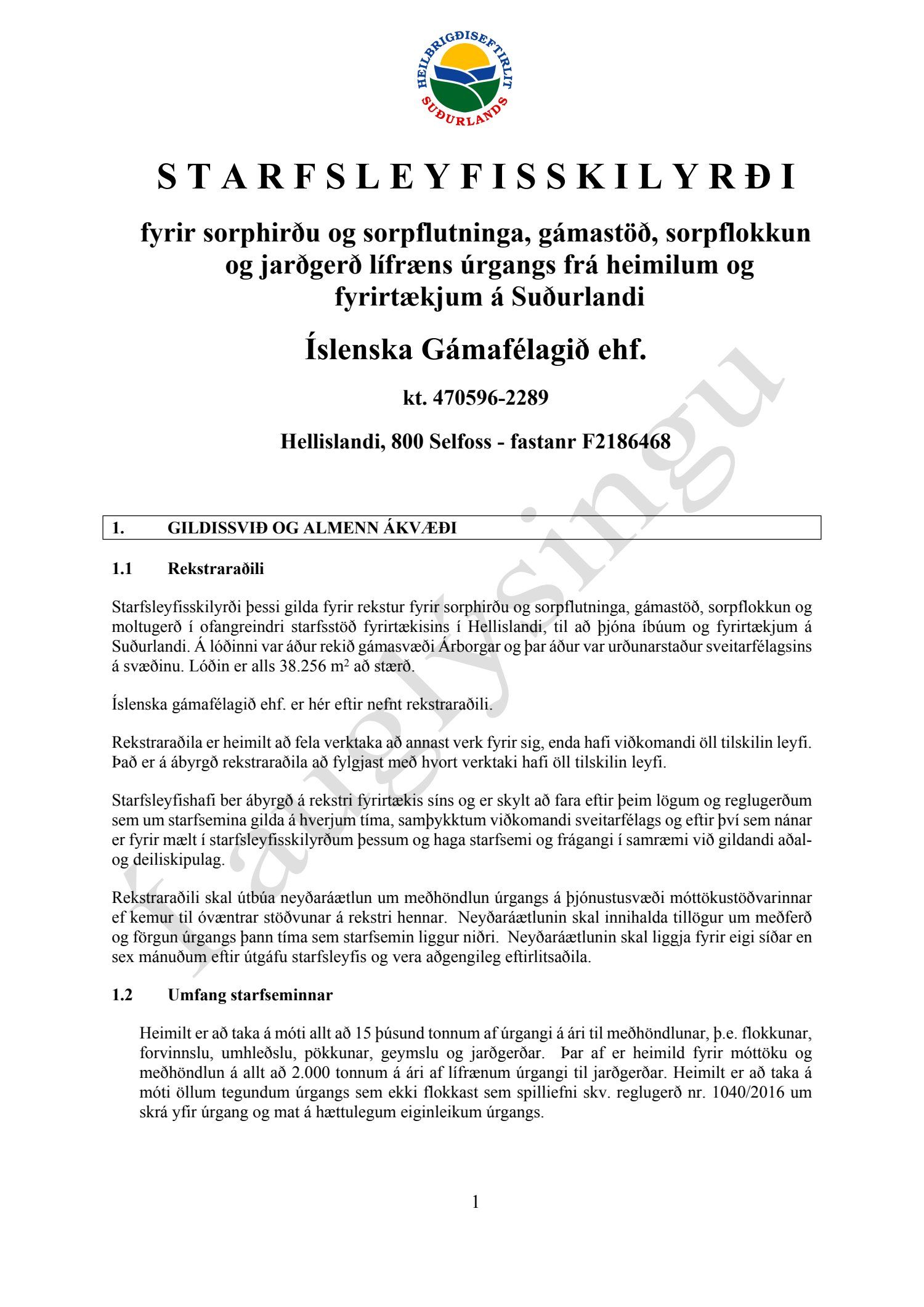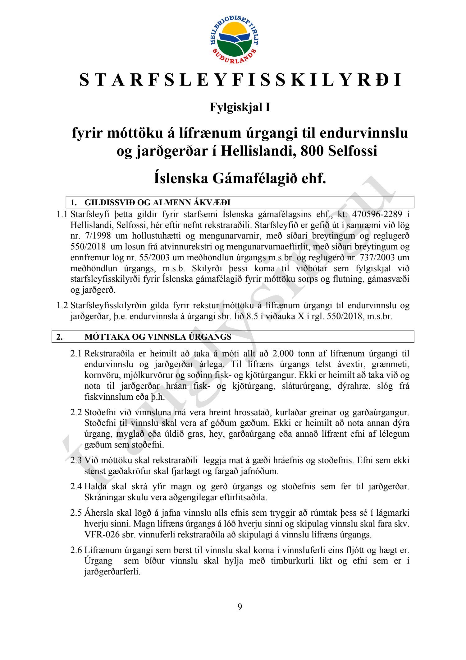 Starfsleyfisskilyrði frá Heilbrigðiseftirliti Suðurlands dags. 21. ágúst, fyrir starfsstöð Íslenska gámafélagið ehf. í Hellislandi.