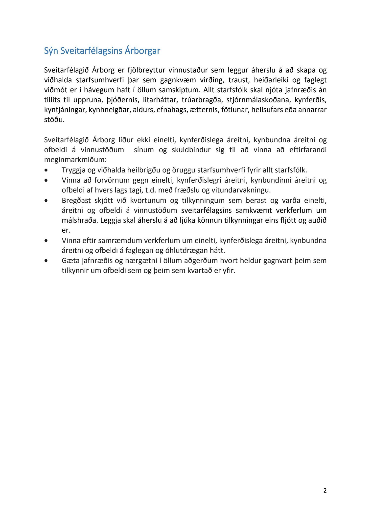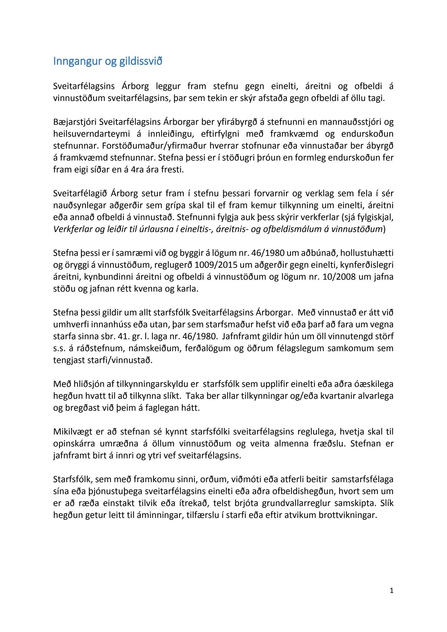 Gísli Halldór Halldórsson, bæjarstjóri, tók til máls og fylgdi úr hlaði tillögu að stefnu gegn einelti, áreitni og ofbeldi á vinnustöðum Sveitarfélagsins Árborgar, ásamt aðgerðaráætlun og lagði til að stefnan verði samþykkt.