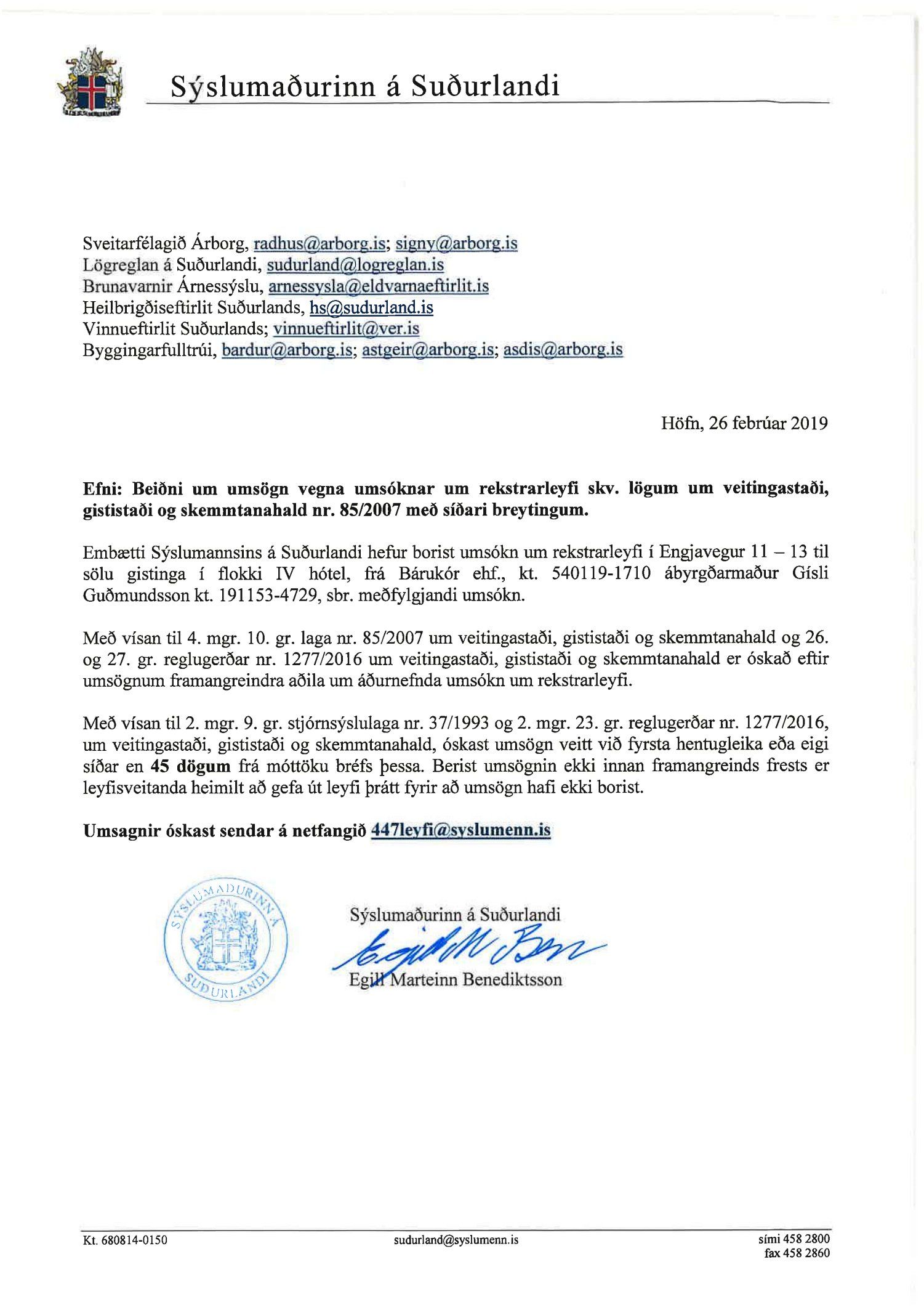 Beiðni Sýslumannsins á Suðurlandi, dags. 26. febrúar, þar sem óskað er eftir umsögn um rekstrarleyfi til sölu á gistingu í flokki IV hótel á Eyravegi 11-13. Umsækjandi Bárukór ehf, kt. 540119-1710.