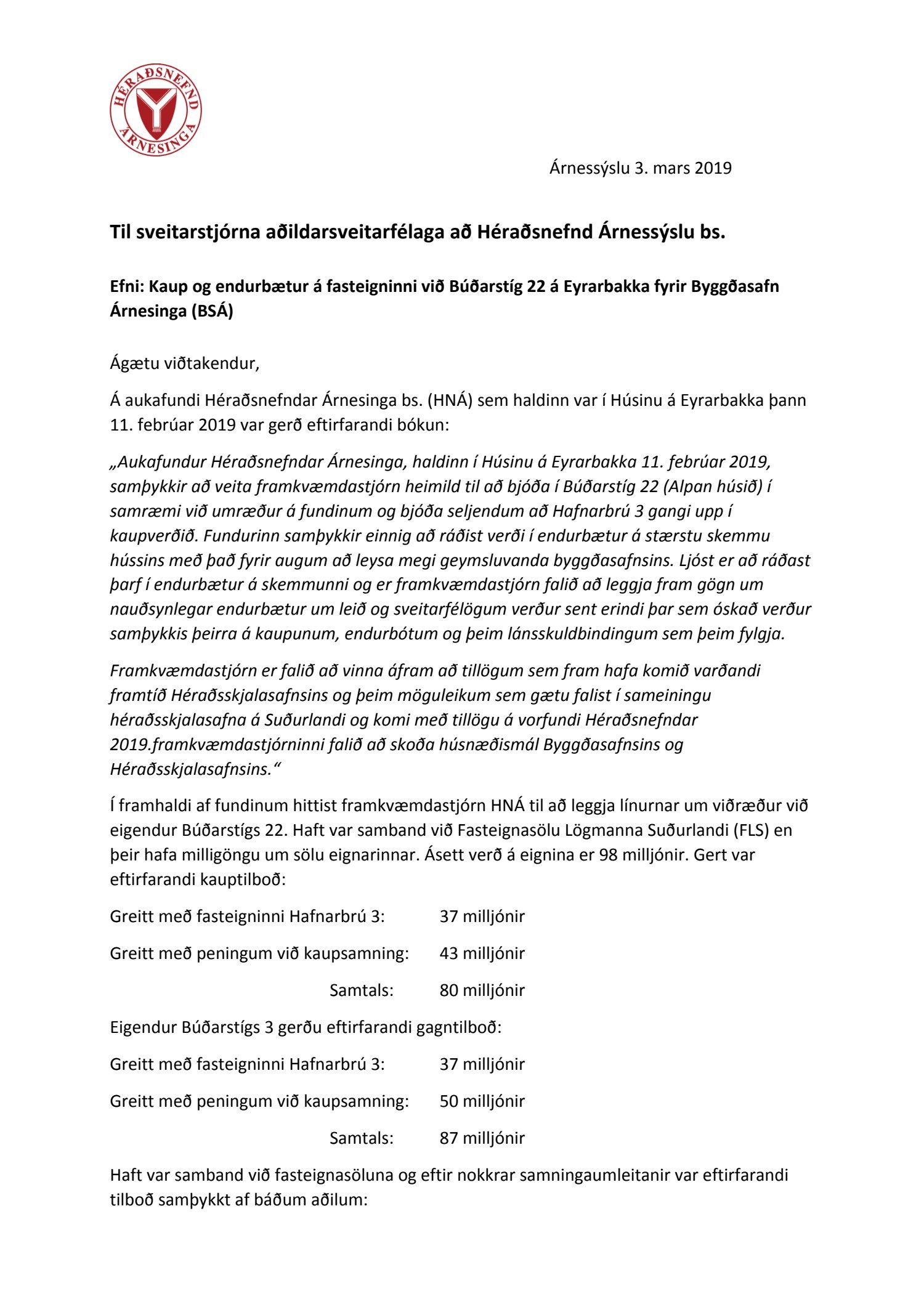 Sveitarfélagið Árborg samþykkir hér með að veita einfalda ábyrgð á sínum hluta vegna lántöku stofnunar Héraðsnefndar Árnesinga, Byggðasafni Árnesinga, hjá Lánasjóði sveitarfélaga að upphæð 100.000.000 kr. til allt að 15 ára.