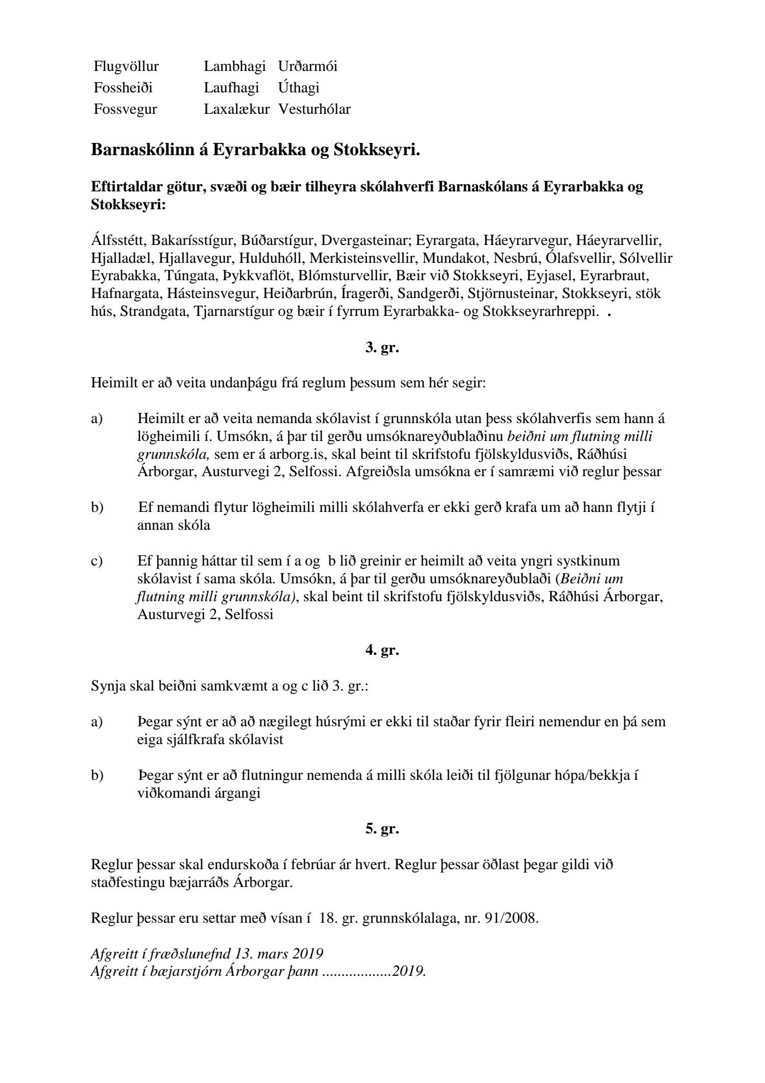 Tillaga frá 9. fundi fræðslunefndar frá 13. mars sl., liður 6 - Reglur um innritun í grunnskóla í Sveitarfélaginu Árborg. Fræðslunefnd samþykkir reglurnar og vísar þeim til frekari afgreiðslu í bæjarstjórn.
