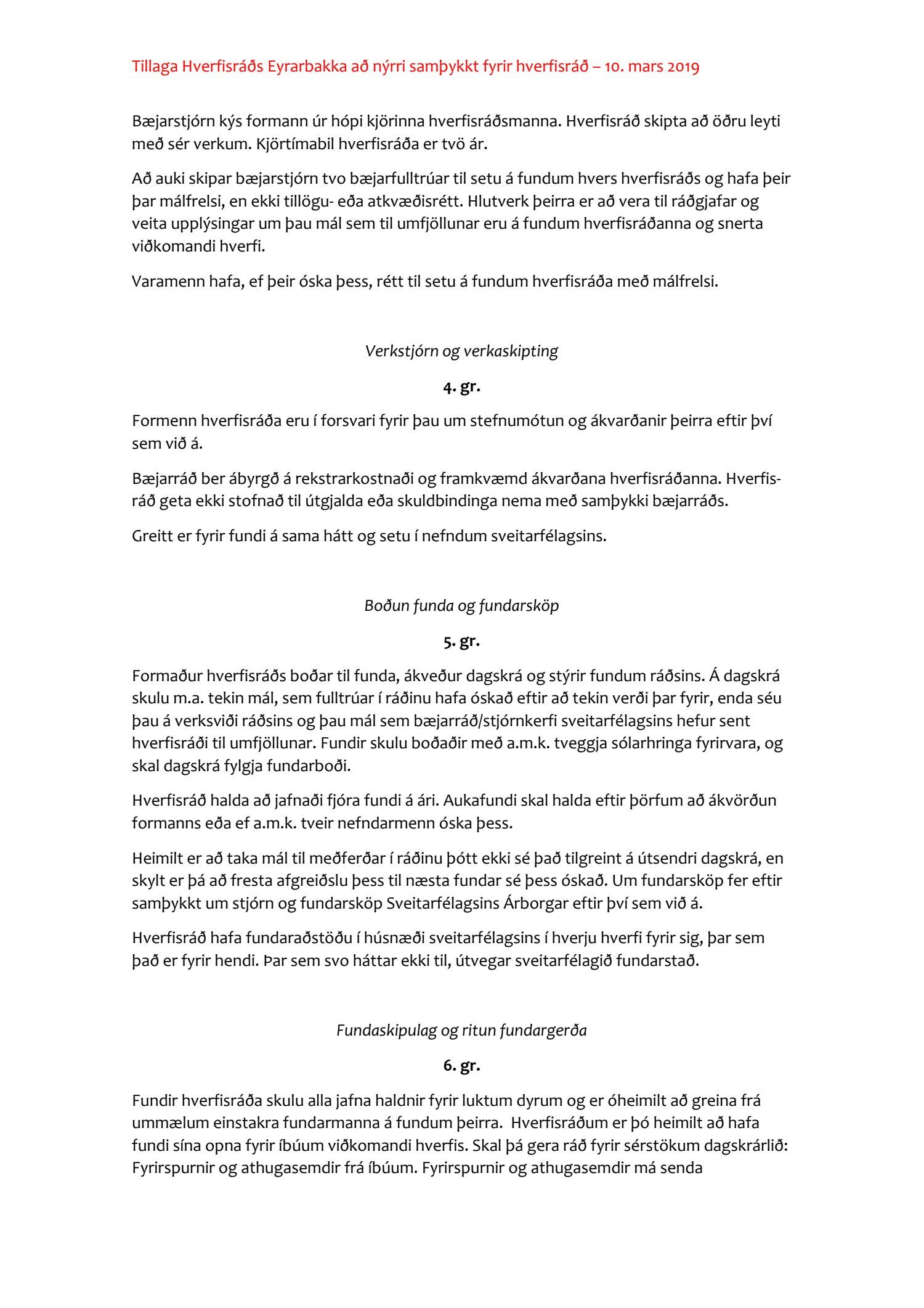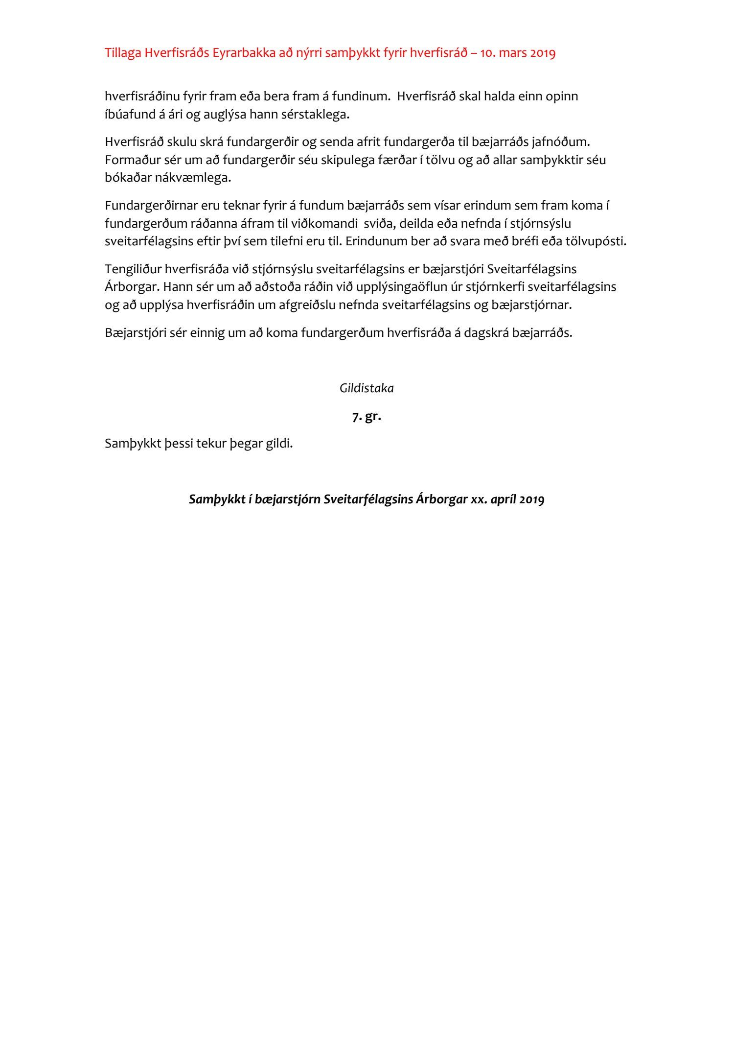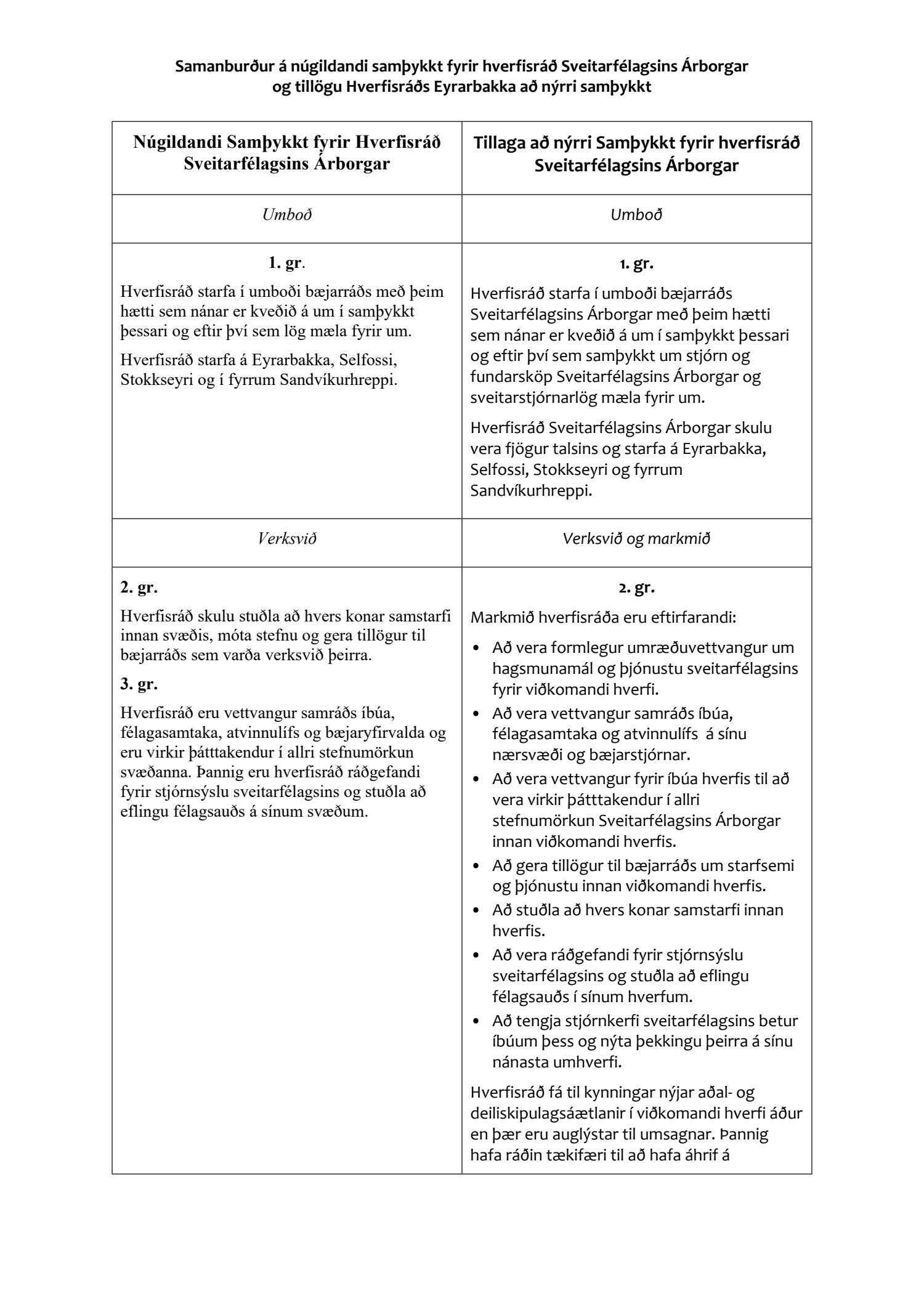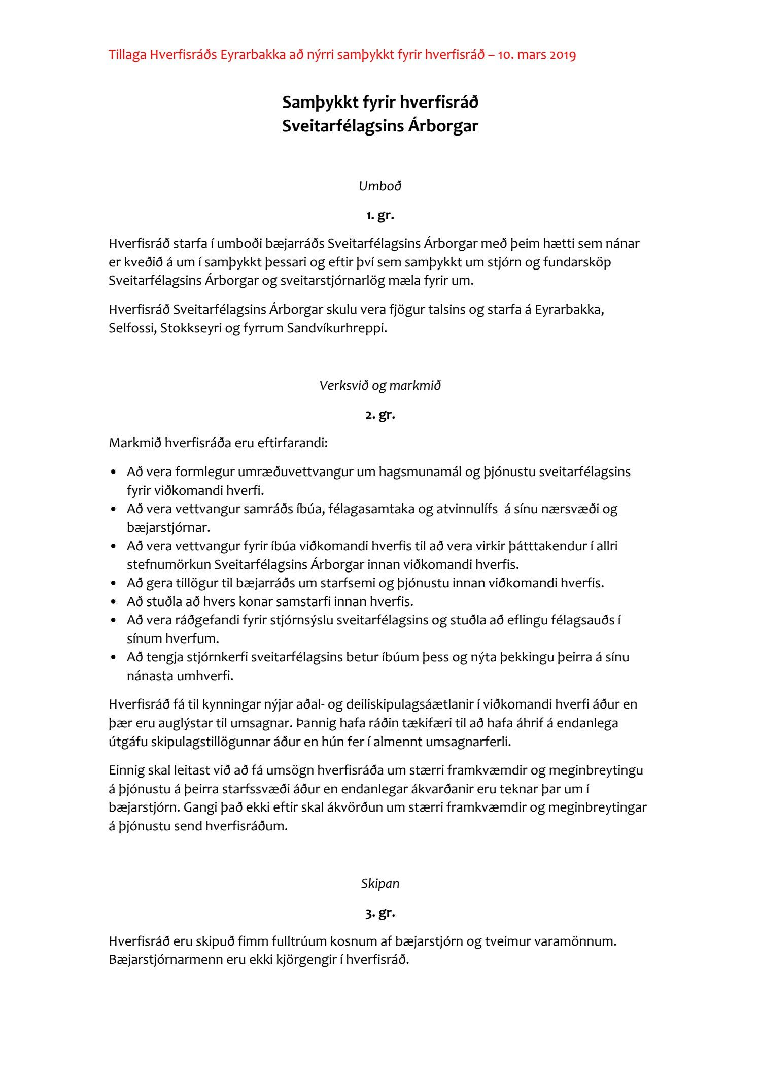 Bæjarráð þakkar metnaðarfulla tillögu hverfisráðs Eyrarbakka að nýjum samþykktum hverfisráða Árborgar en frestar frekari umfjöllun um tillöguna þar til öðrum hverfisráðum hefur gefist kostur á að koma á framfæri sínum tillögum um þær.