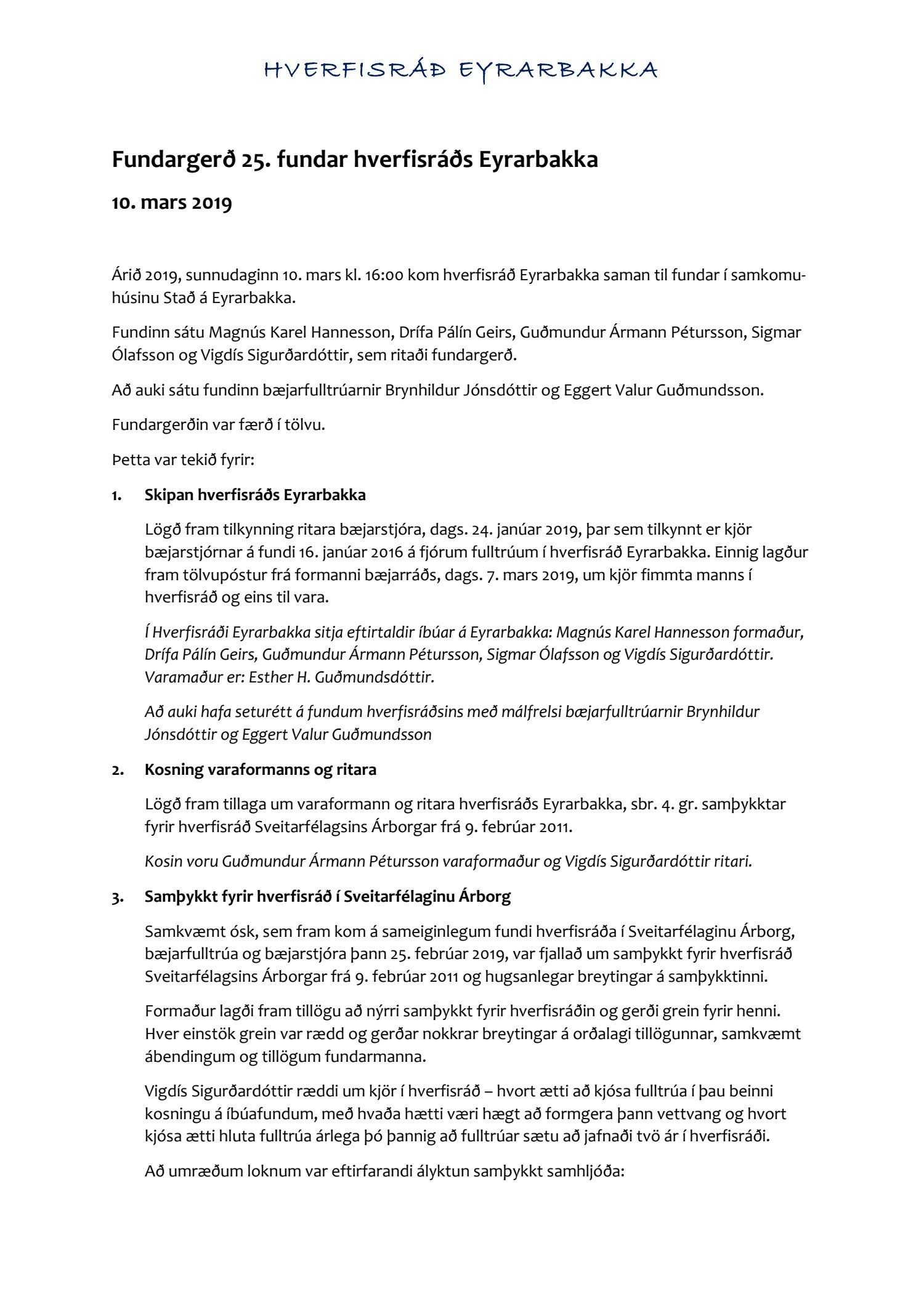 25. fundur hverfisráðs Eyrarbakka, haldinn 10. mars 2019, ásamt tillögum að breytingum á samþykktum fyrir hverisráð Sveitarfélagsins Árborgar
