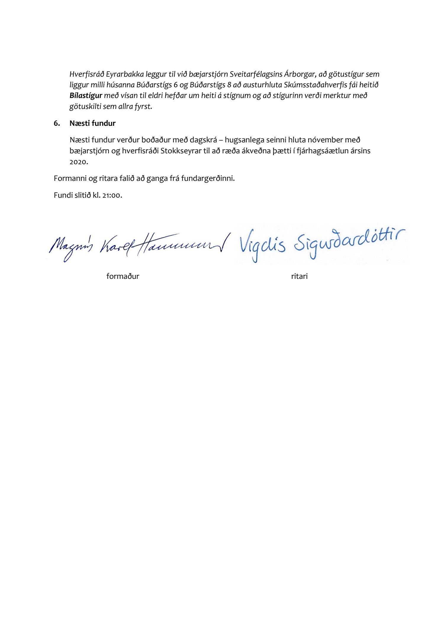 4. Bæjarráð tekur jákvætt í tillöguna og vísar tillögu um heiti Bílastígs til afgreiðslu skipulags- og byggingarnefndar að fenginni umsögn frístunda- og menningarnefndar.