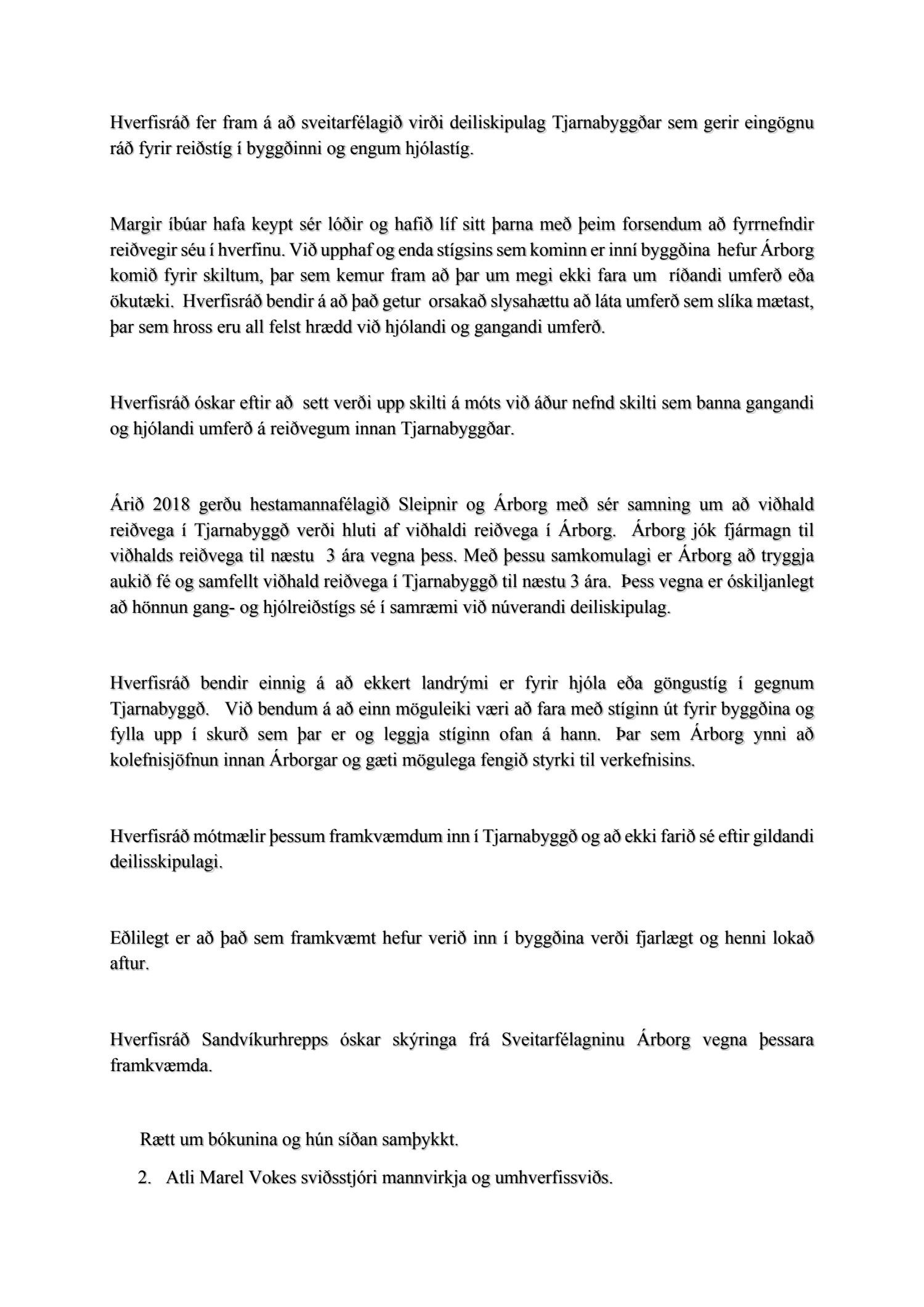 1. Bæjarráð felur sviðsstjóra mannvirkja- og umhverfissviðs að leita lausna á þeim málum sem út af standa vegna nýs göngu- og hjólastígs við Tjarnabyggð.