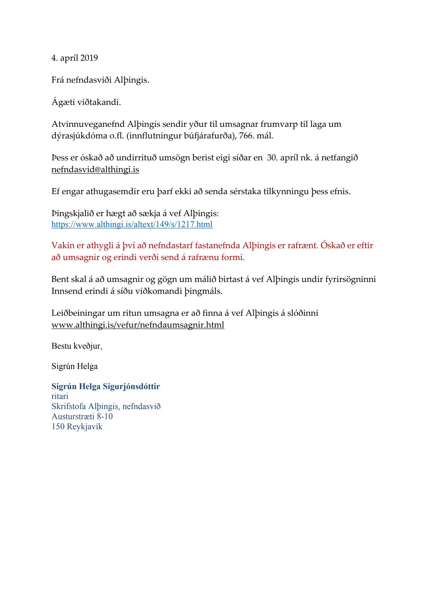 Erindi frá atvinnuveganefnd Alþingis, dags. 4. apríl, þar sem óskað er eftir umsögn um frumvarp til laga um dýrasjúkdóma o.fl. (innflutningur búfjárafurða), mál 766.