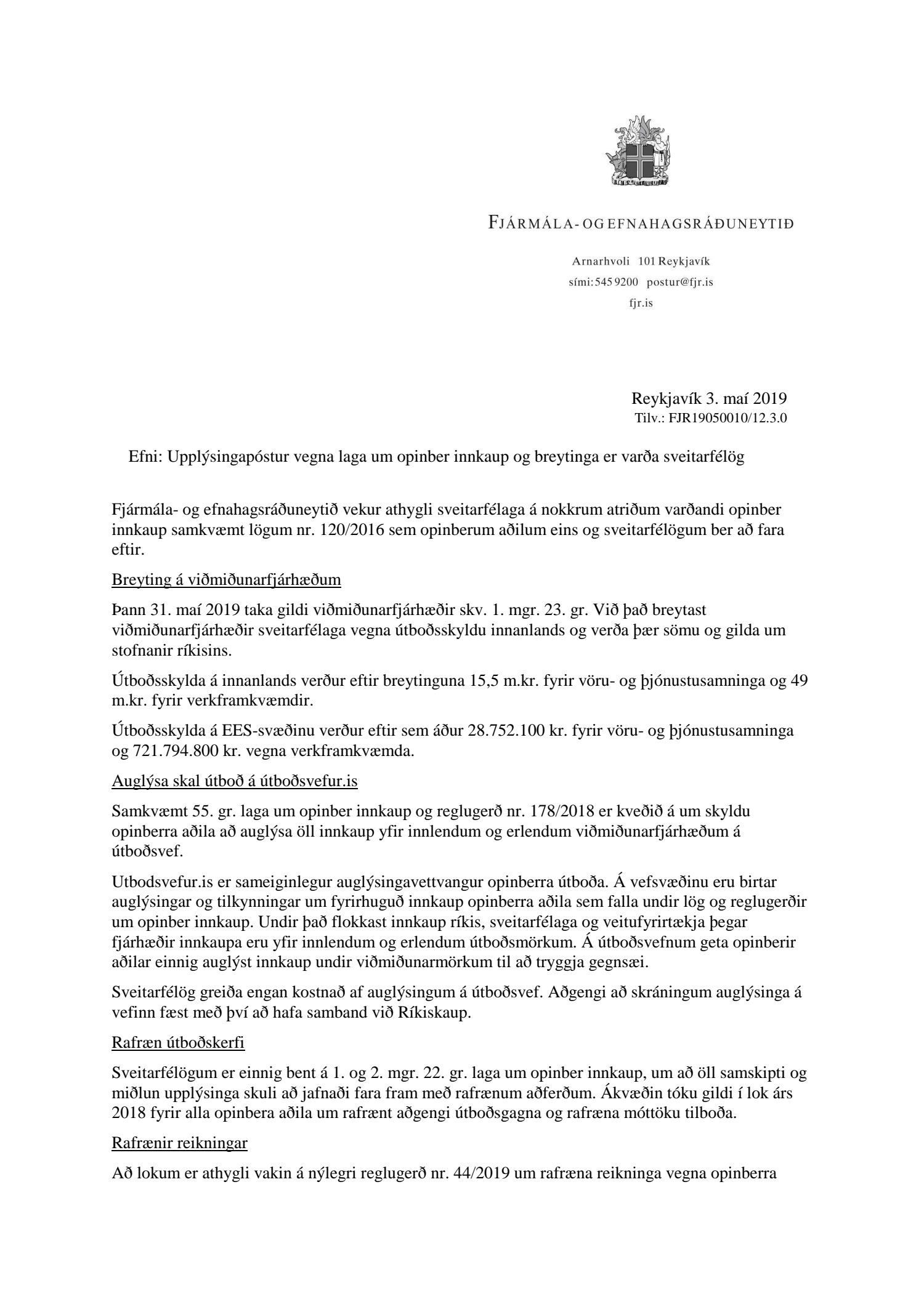 Lagður fram upplýsingapóstur frá fjármála- og efnahagsráðuneytinu vegna laga um opinber innkaup og breytinga er varða sveitarfélög.