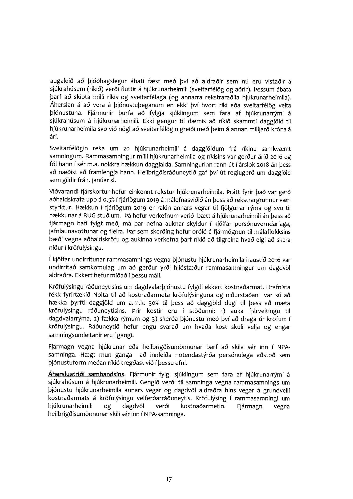 Að rekstrarforsendur hjúkrunar- og dagdvalarrýma á öldrunarstofnunum verði treystar, þannig að daggjöld taki mið af kröfulýsingum fyrir þessar stofnanir.