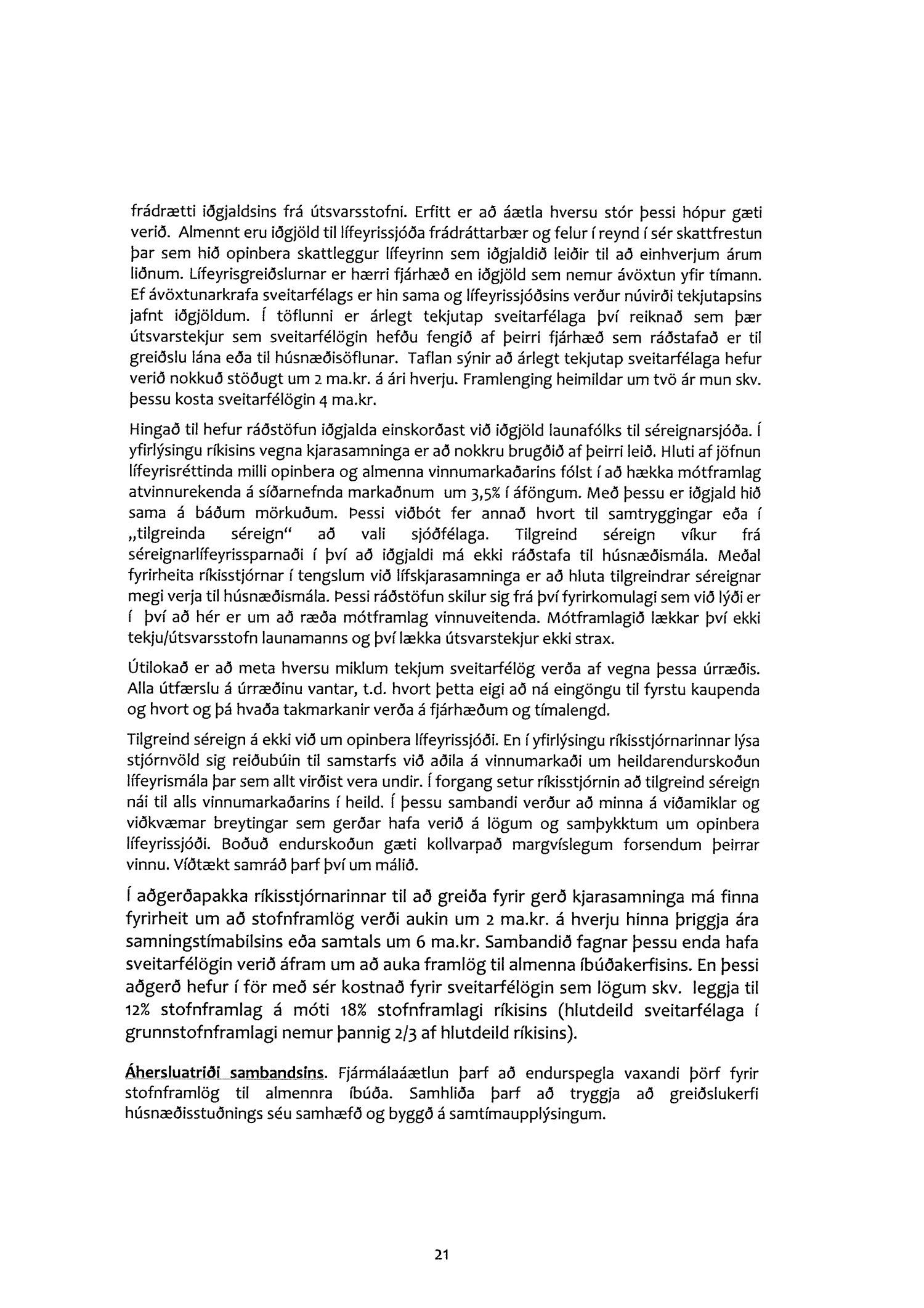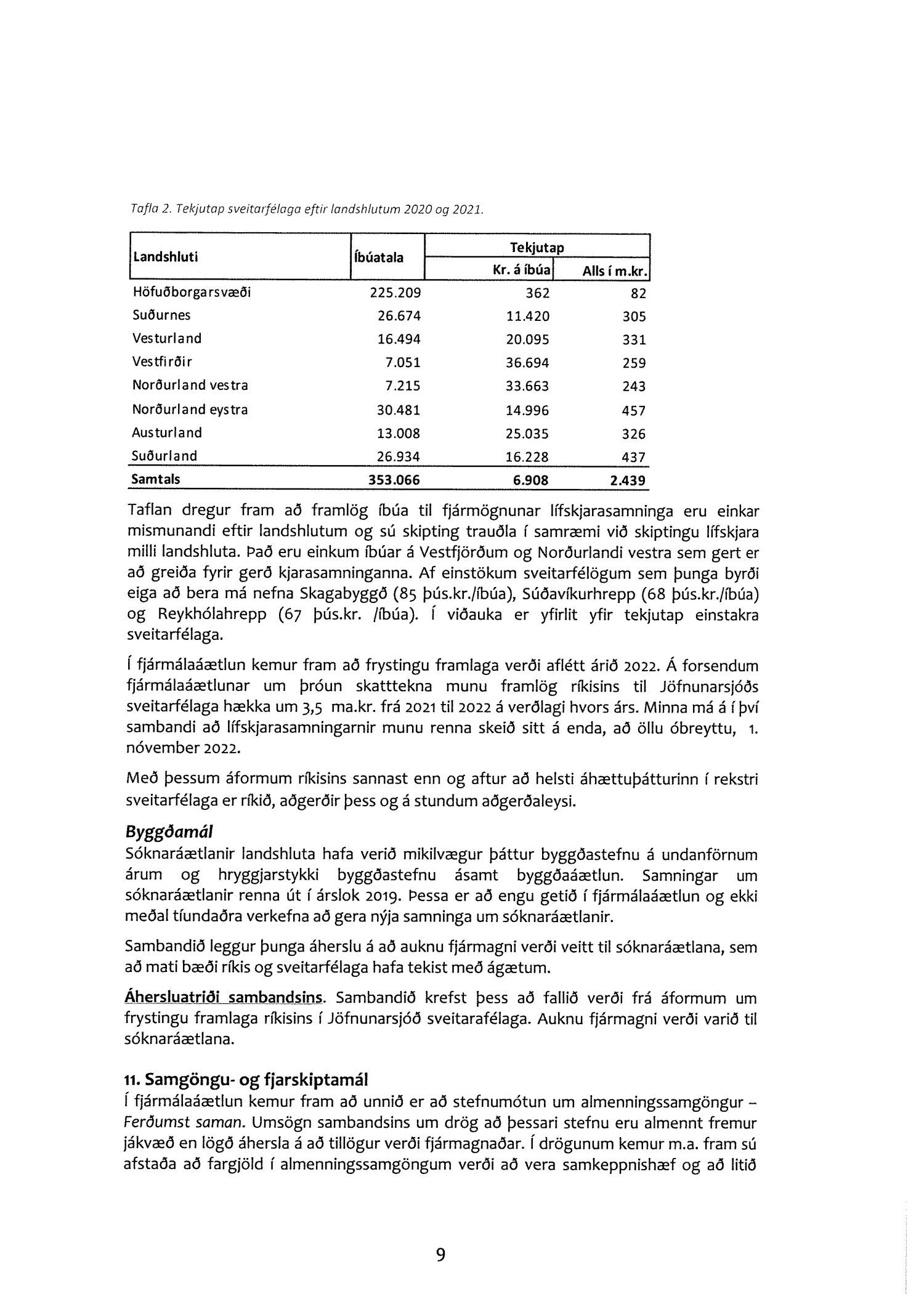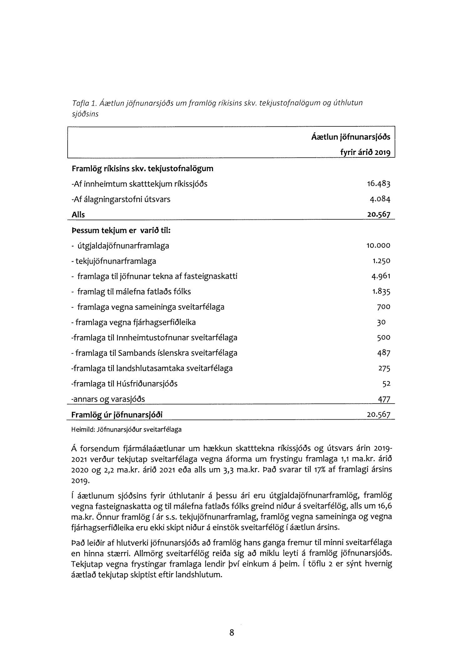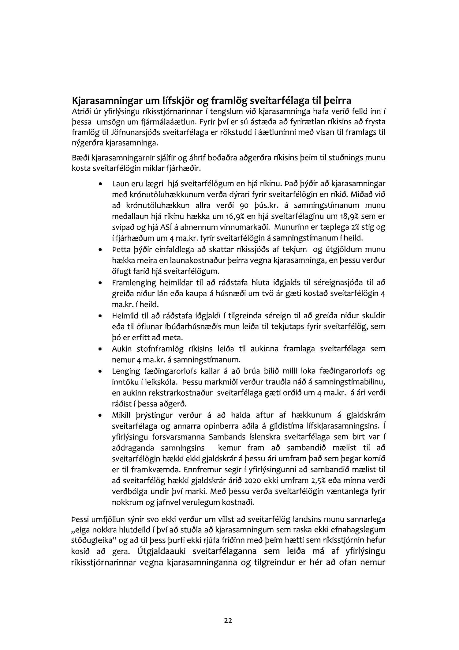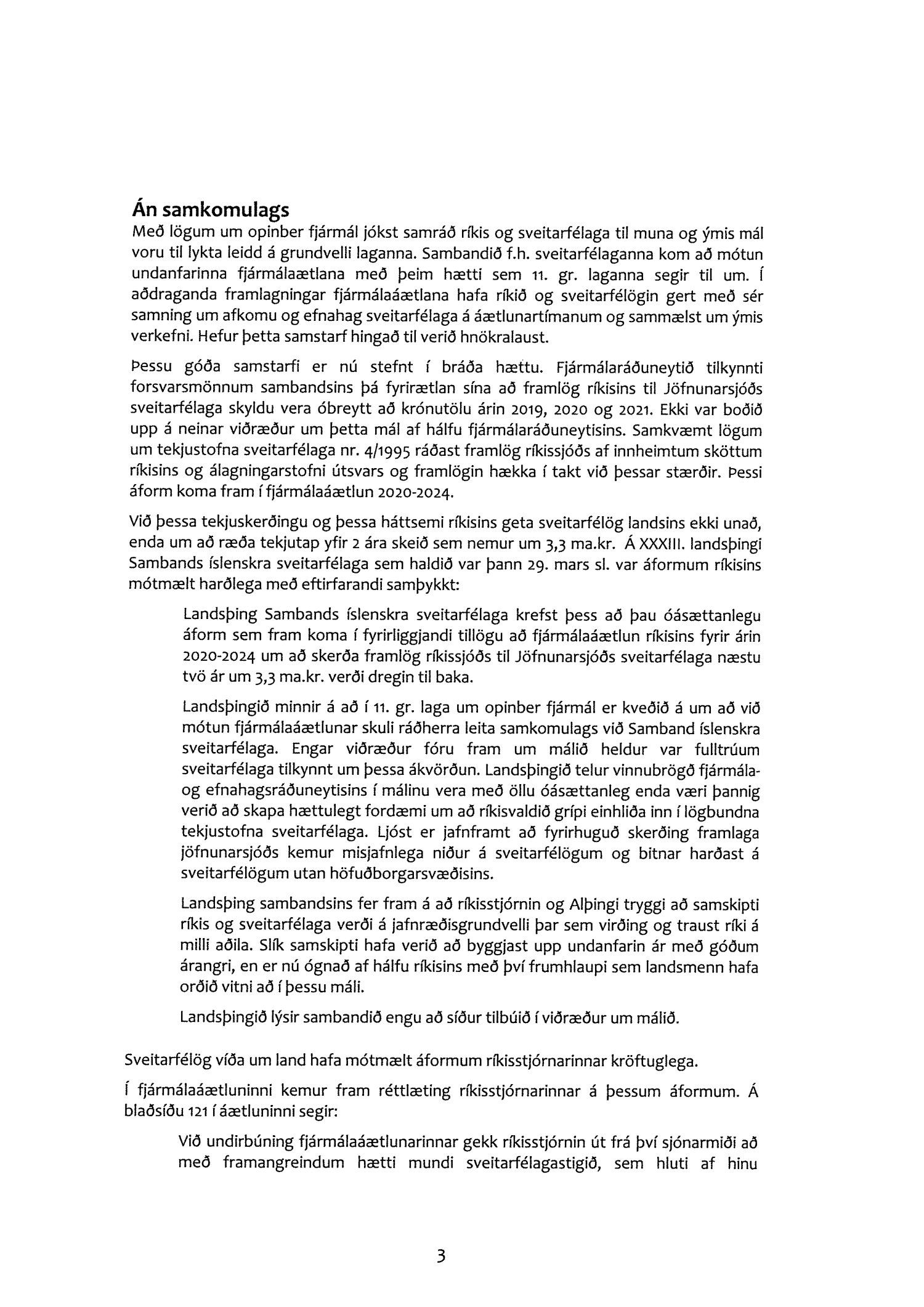 Farið er í umsögninni yfir þá hnökra sem orðið hafa á samskiptum ríkis og sveitarfélaga í tengslum við þá einhliða ákvörðun ríkisstjórnarinnar að frysta framlög til Jöfnunarsjóðs sveitarfélaga á árunum 2020 og 2021. Skerðingin nemur samtals 3-3,5 ma.kr. og bitnar harðast á fámennum sveitarfélögum. Gerð er skýlaus krafa um að Alþingi dragi til baka þessi áform ríkisstjórnarinnar.