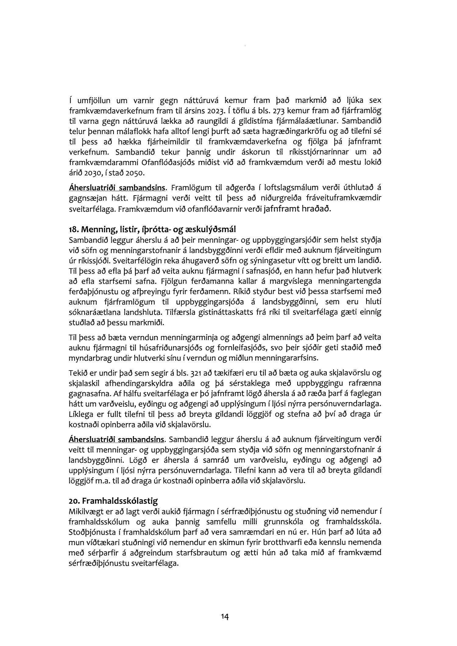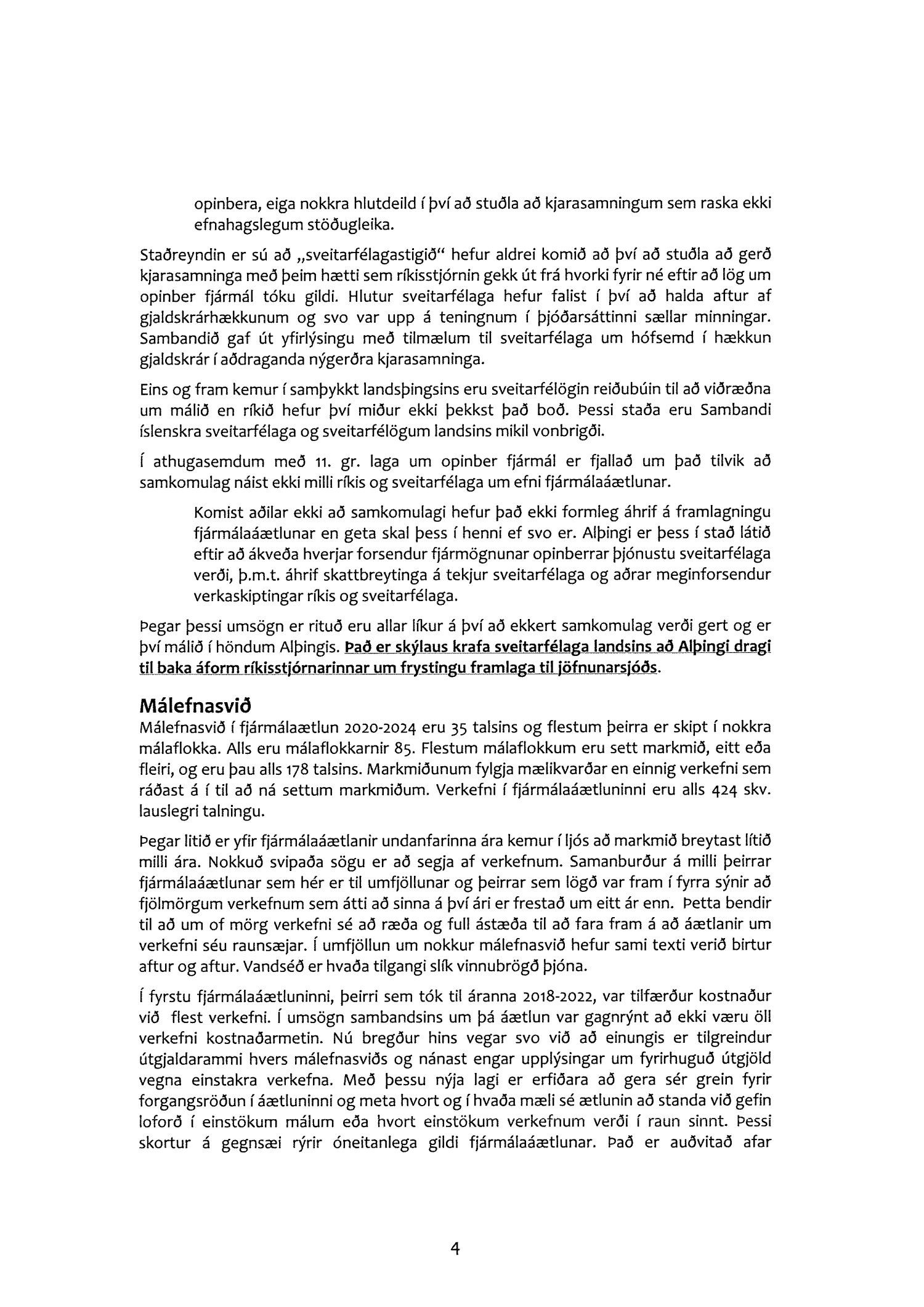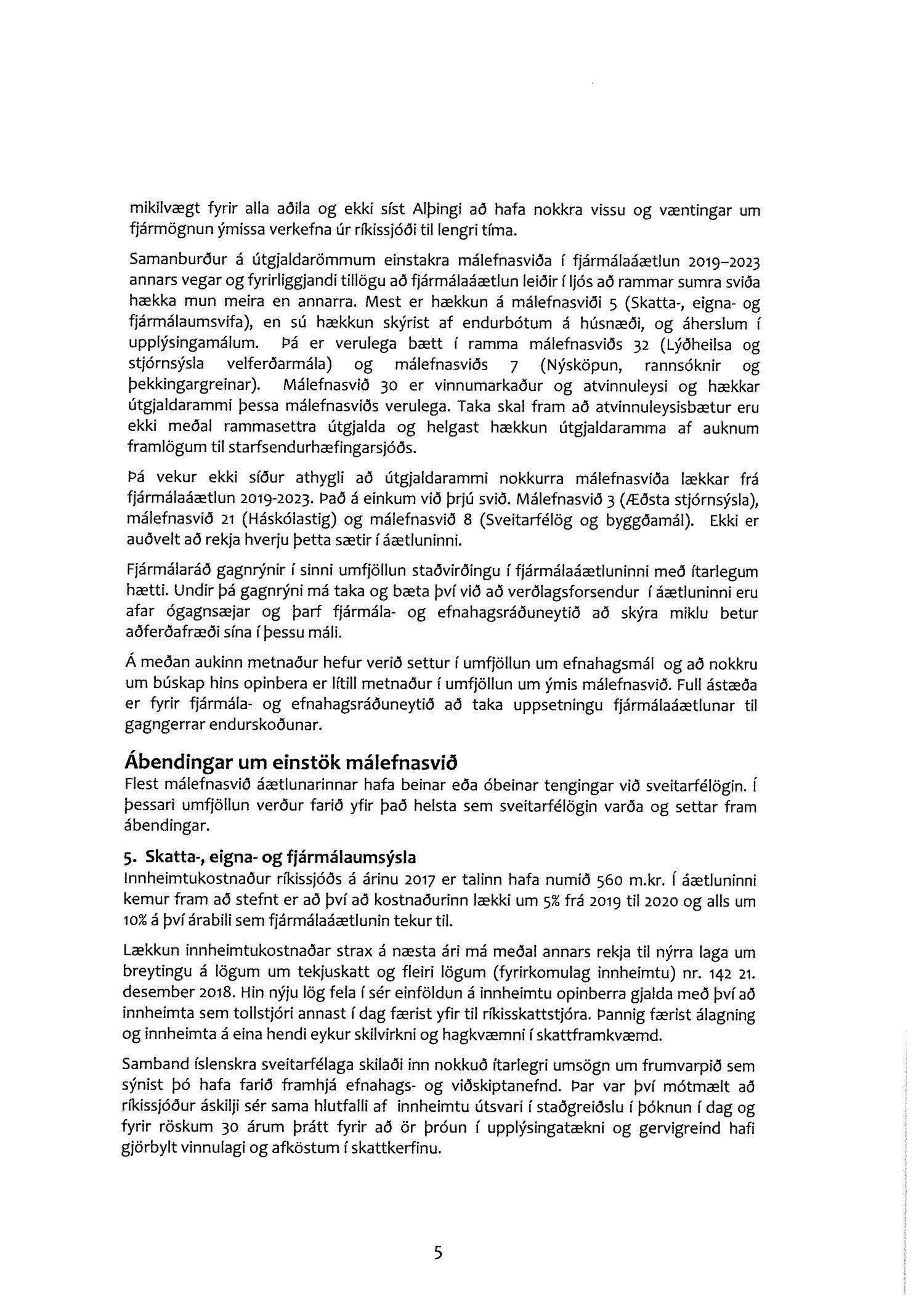 Í umsögninni er einnig farið nokkuð ítarlega yfir einstök málefnasvið í fjármálaáætluninni enda snúa fjölmargar aðgerðir að samskiptum ríkis og sveitarfélaga. Á meðal atriða sem sambandið leggur mesta áherslu á má nefna: