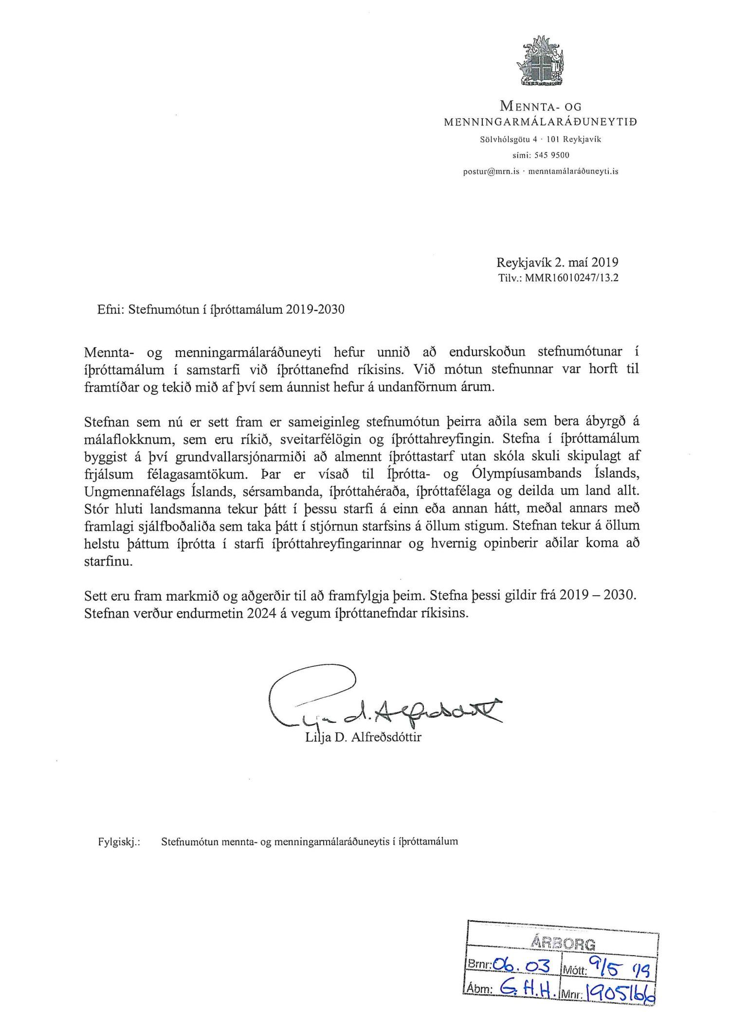 Stefnumótun frá mennta- og menningarmálaráðuneytisins í íþróttamálum, dags. 2. maí.