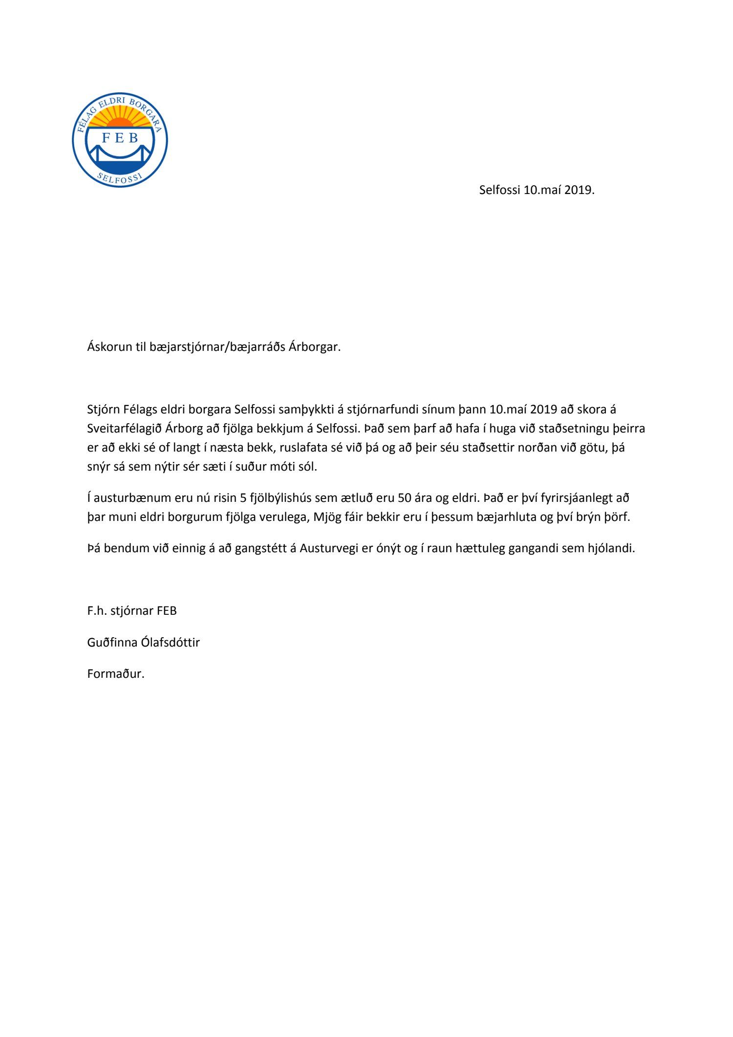 Áskorun frá Félagi eldri borgara Selfossi, dags. 10. maí, um að fjölga bekkjum á Selfossi.