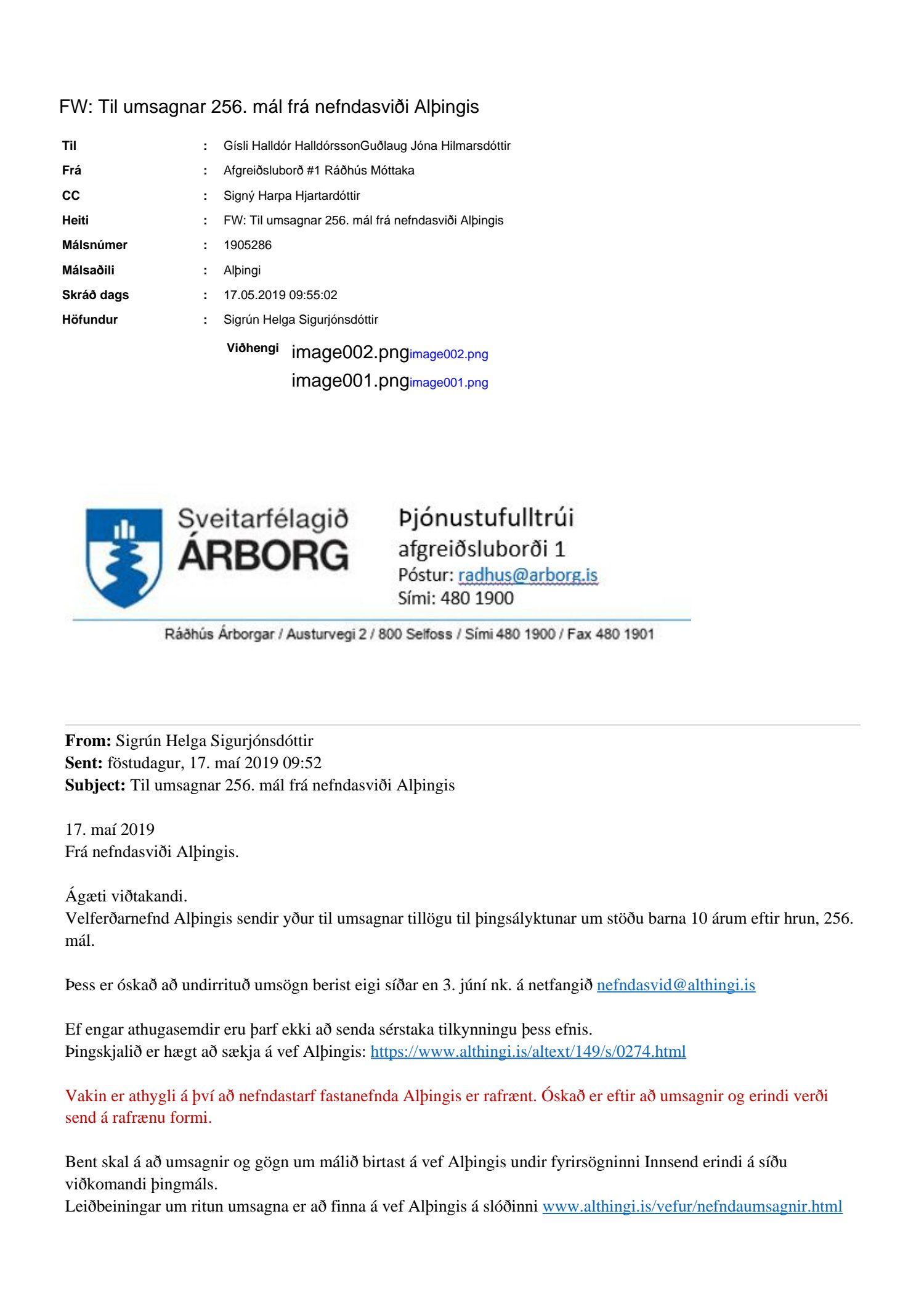 Erindi frá velferðarnefnd Alþingis, dags. 17. maí, þar sem óskað er eftir umsögn um tillögu til þingsályktunar um stöðu barna 10 árum eftir hrun, mál 256. Umsagnarfrestur er til 3. júní.