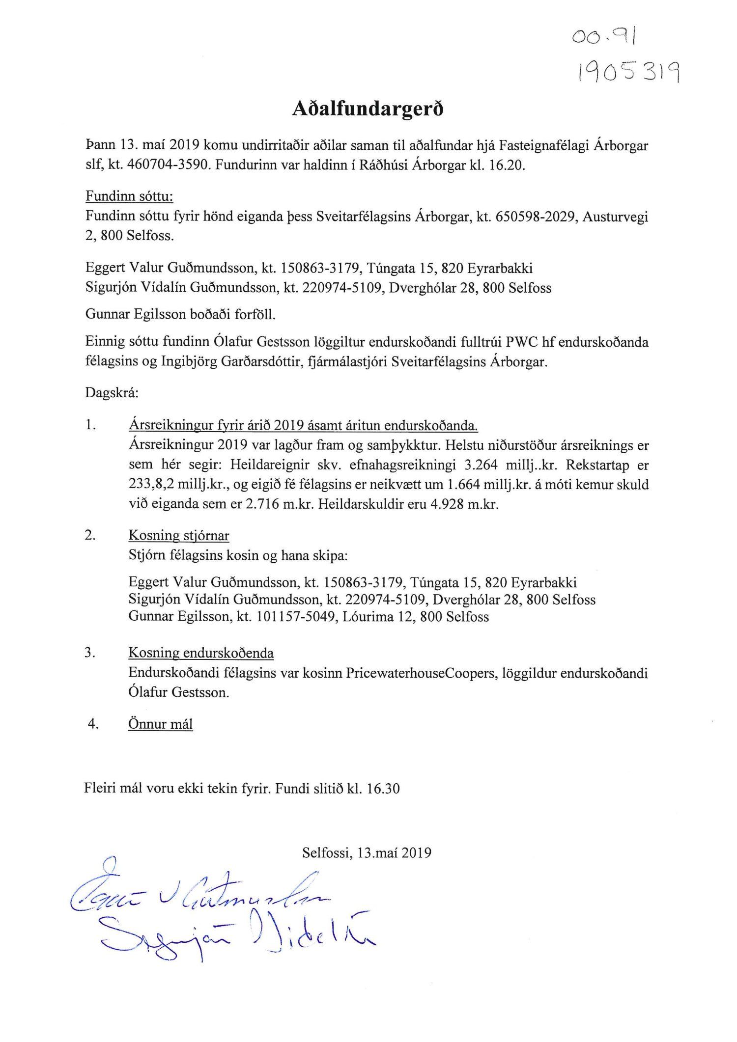 Fundargerðir Fasteignafélags Árborgar slf. 2019