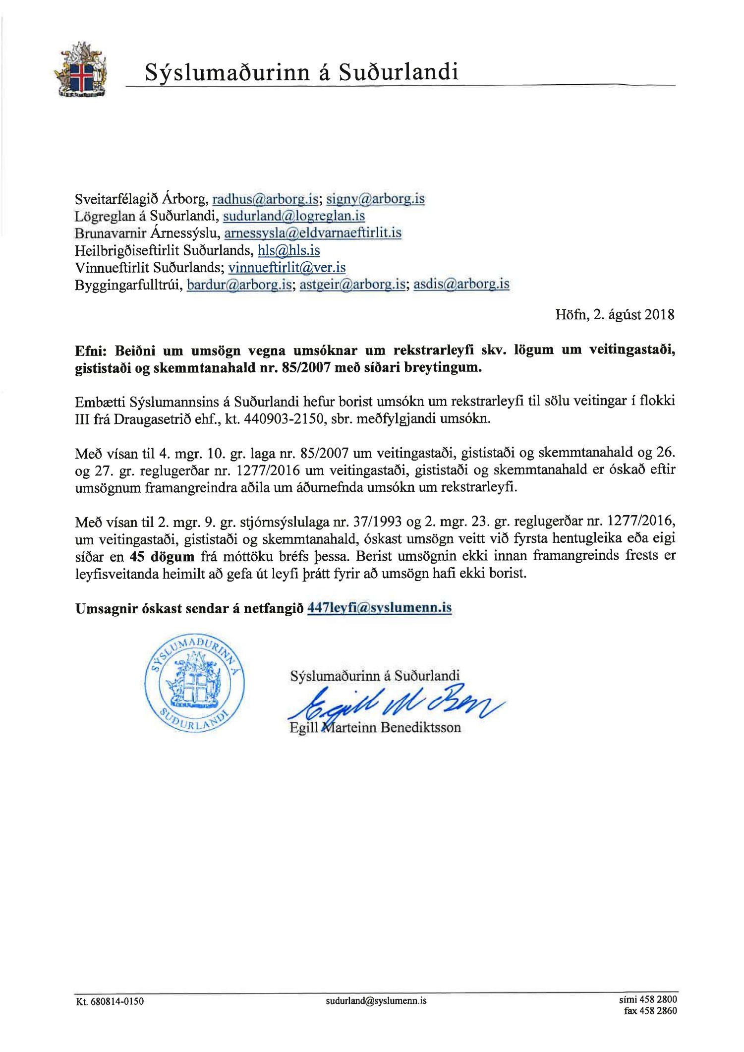 Beiðni Sýslumannsins á Suðurlandi, dags. 2. ágúst 2018 um umsögn um rekstrarleyfi til sölu veitinga í flokki III að Hafnargötu 9, Stokkseyri. Umsækjandi er Draugasetrið ehf, kt. 440309-2150.