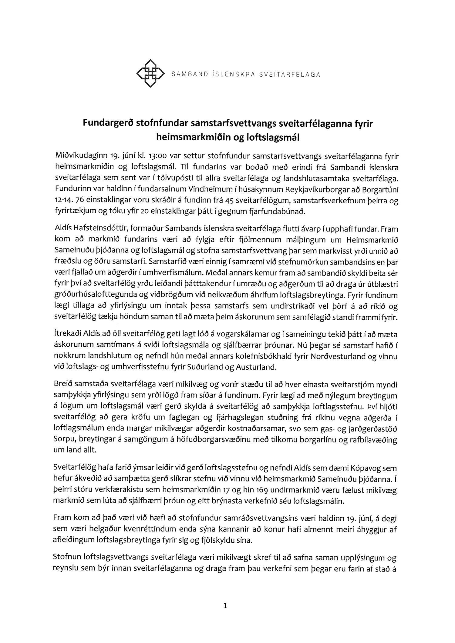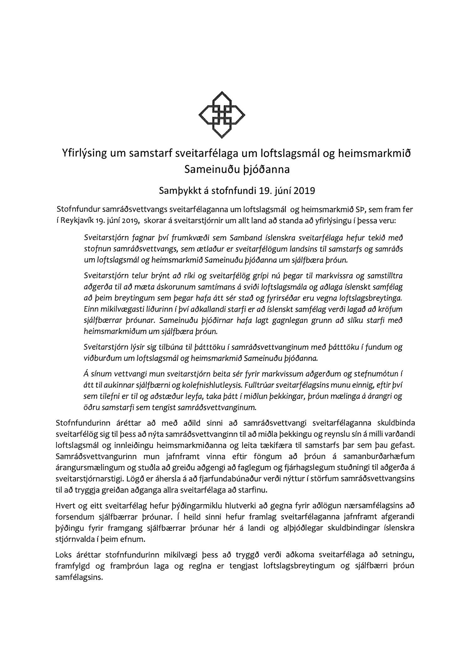 Drög að yfirlýsingu frá Sambandi íslenskra sveitarfélaga, dags. 26. júní, um samstarf sveitarfélaga um loftslagsmál og heimsmarkmið Sameinuðu þjóðanna. Samband íslenskra sveitarfélaga hvetur sveitarfélög til að samþykkja yfirlýsinguna.