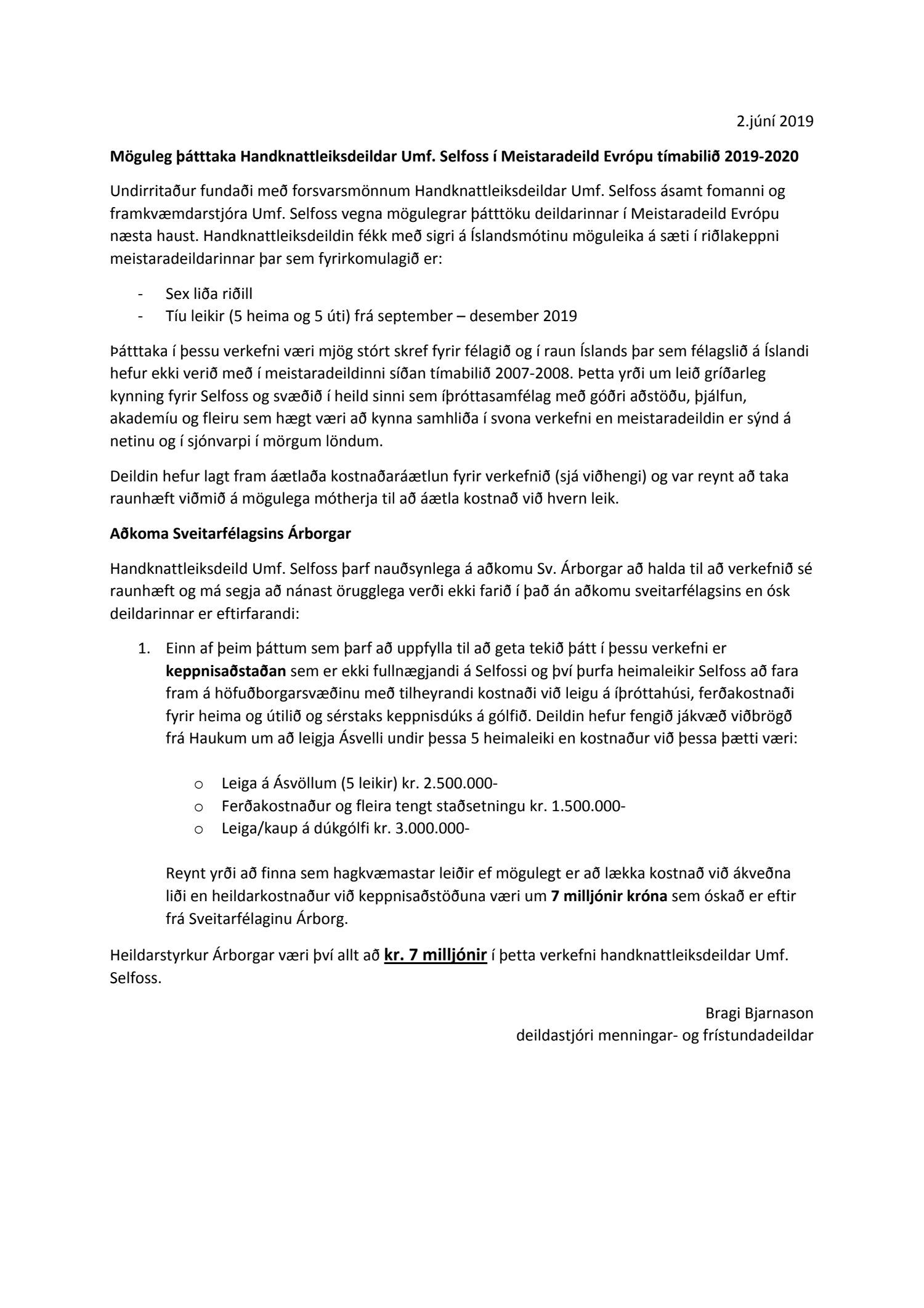 Bæjarráð samþykkir því ósk handknattleiksdeildar Umf. Selfoss um stuðning við þátttöku í Meistaradeild Evrópu 2019-2020. Í því felst að standa straum af kostnaði vegna keppnisaðstöðu samkvæmt meðfylgjandi minnisblaði deildarstjóra frístunda- og menningarmála dags. 2. júní, allt að 7 milljónum króna. Bæjarstjóra falið að ganga frá viðauka og leggja fyrir bæjarstjórn.