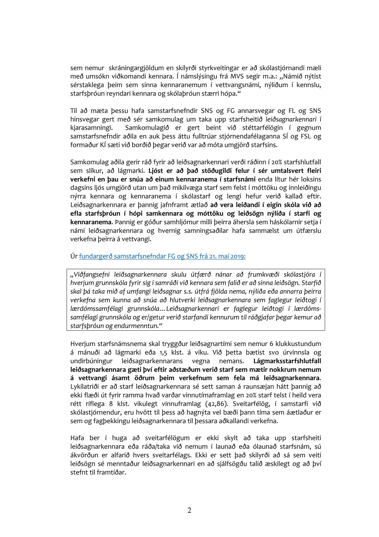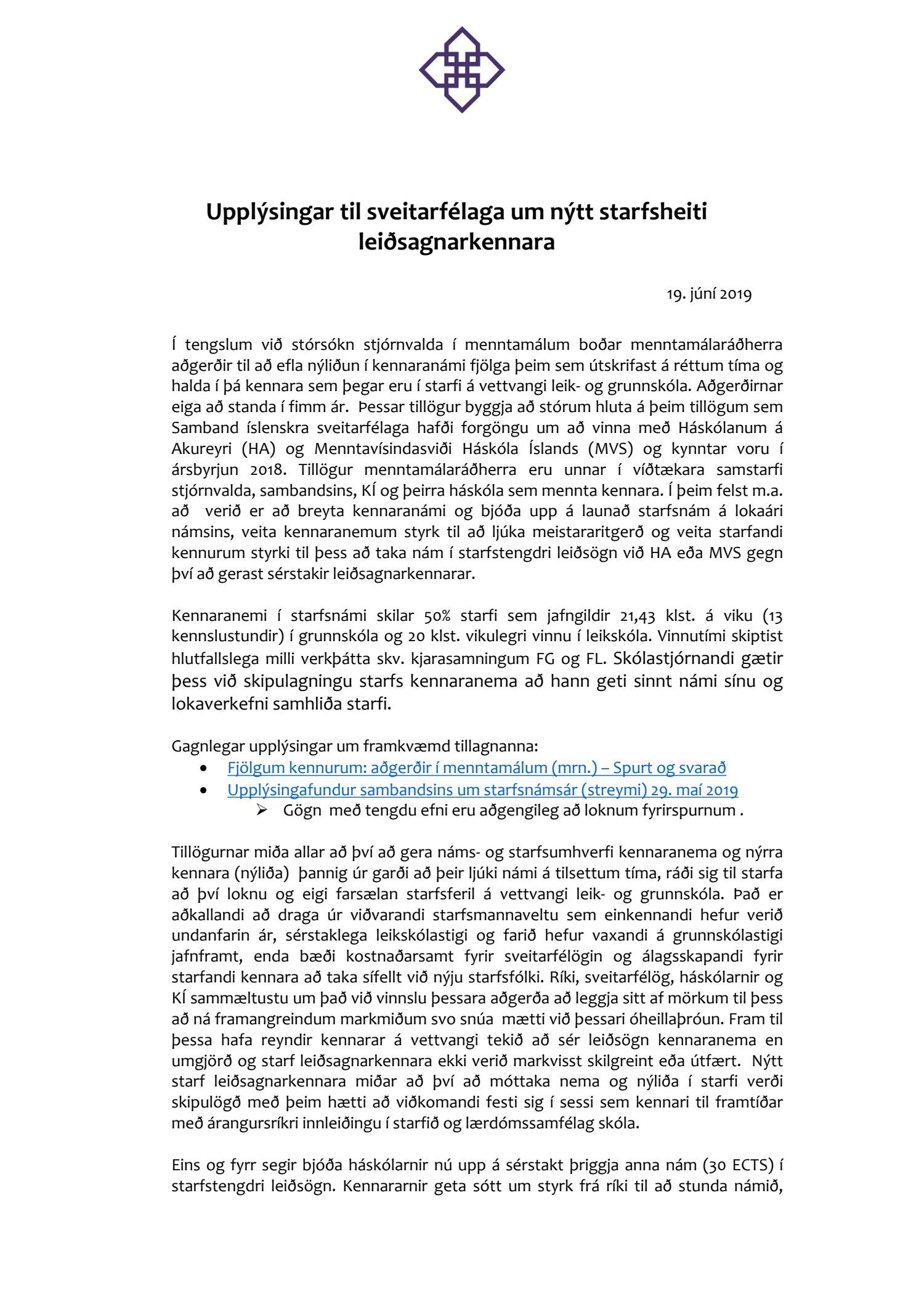 Bæjarráð samþykkir tímabundið 20% stöðugildi leiðsagnarkennara fyrir skólaárið 2019-2020. Áætlaður kostnaður fjárhagsárið 2019 er 611.415.- Bæjarráð gerir ráð fyrir að þessi kostnaður rúmist innan fjárhagsáætlunar.
