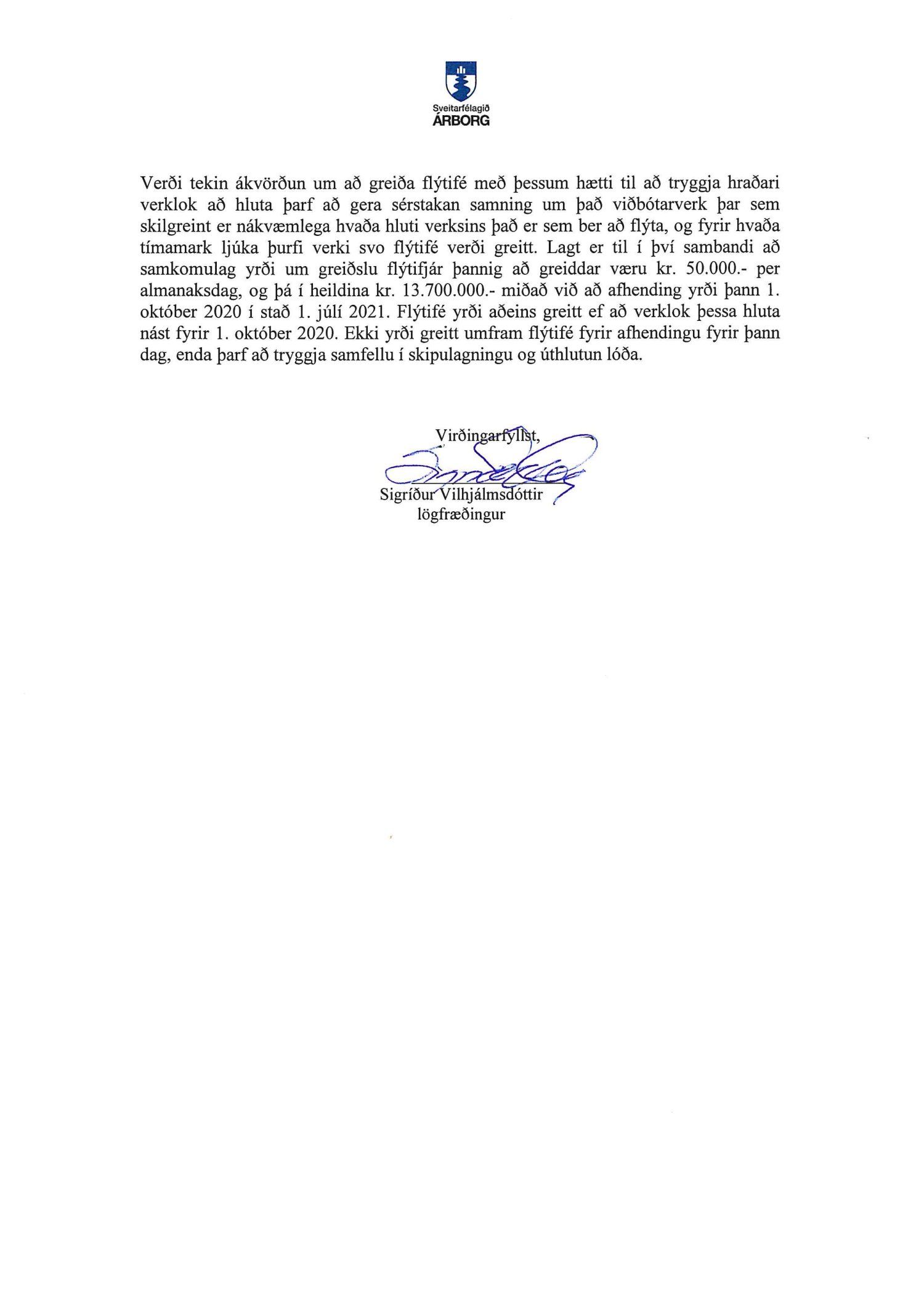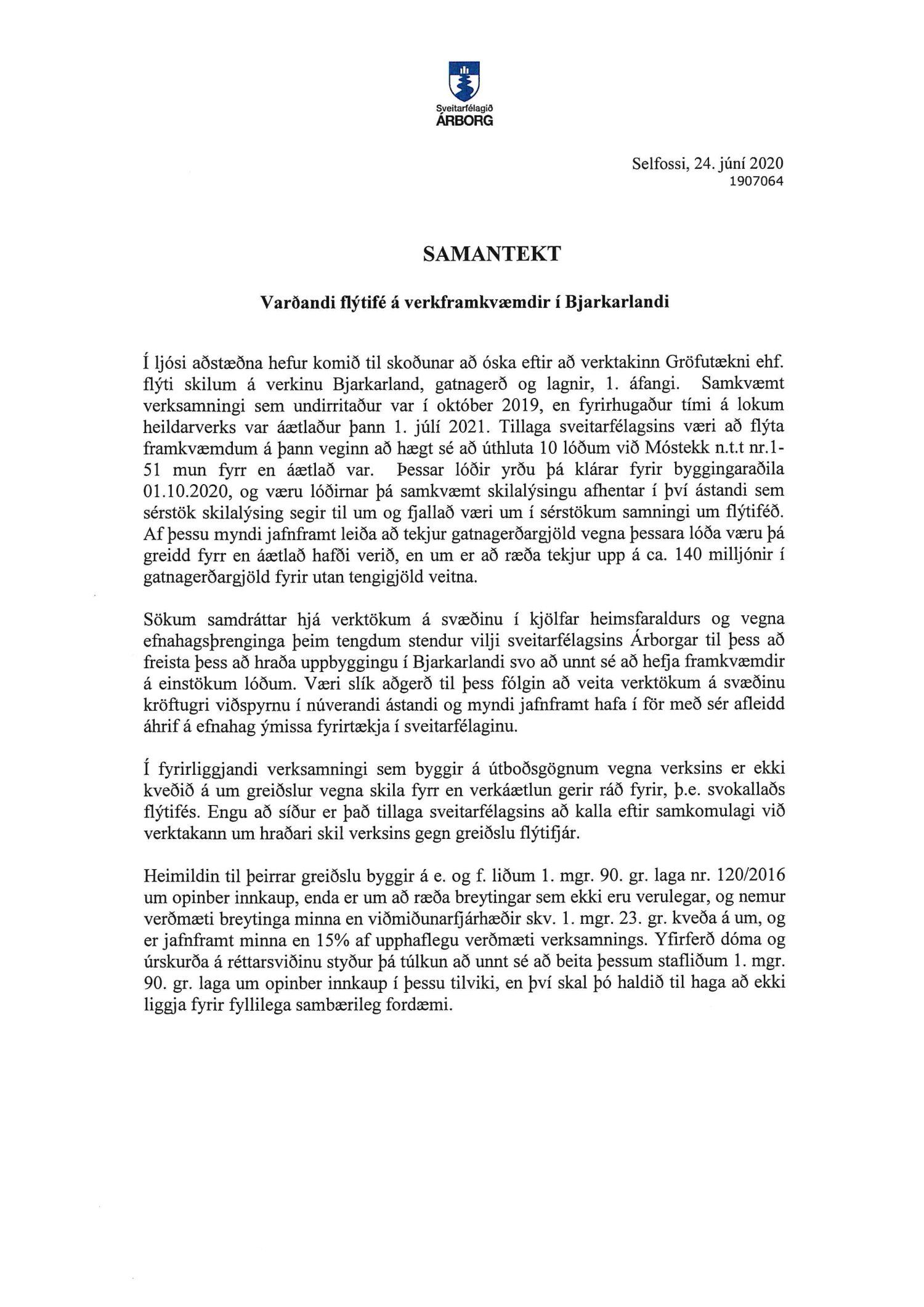 Nefndin leggur til að verktakinn Gröfutækni ehf. verði fengin til að flýta skilum á verkinu Bjarkarland, gatnagerð og lagnir, 1. áfangi. Tillagan snýst um að flýta framkvæmdum á þann veg að hægt sé að úthluta 10 lóðum við Móstekk og greitt flýtifé fyrir. Lóðirnar yrðu þá klárar fyrir byggingaraðila þann 1. október nk. í stað 1. júlí 2021. Sökum samdráttar hjá verktökum á svæðinu í kjölfar heimsfaraldurs og vegna efnahagsþrenginga þeim tengdum stendur vilji sveitarfélagsins Árborgar til þess að freista þess að hraða uppbyggingu í Bjarkarlandi svo að unnt sé að hefja framkvæmdir á einstökum lóðum. Væri slík aðgerð til þess fólgin að veita verktökum á svæðinu kröftugri viðspyrnu í núverandi ástandi og myndi jafnframt hafa í för með sér afleidd áhrif á efnahag ýmissa fyrirtækja í sveitarfélaginu.