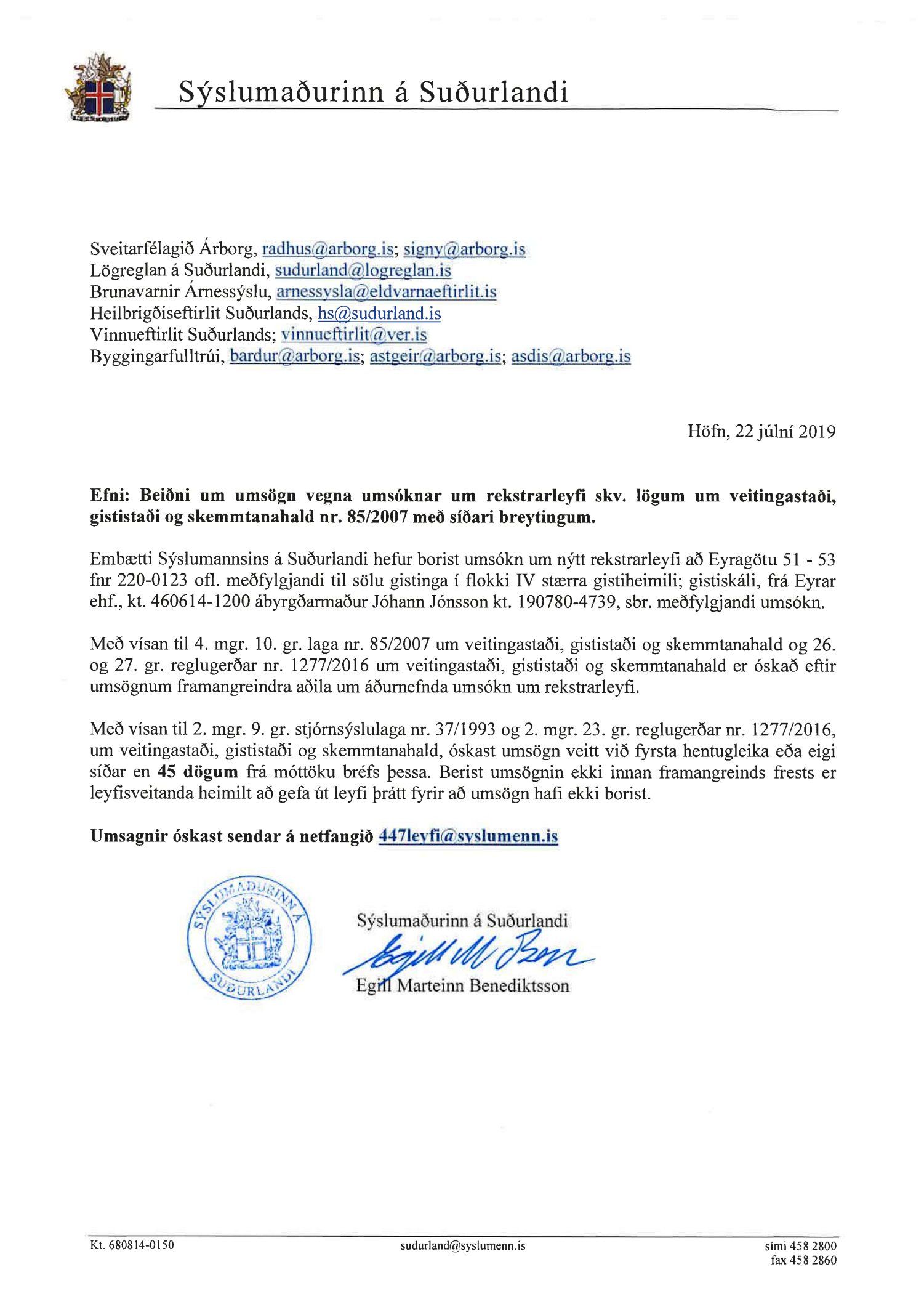 Beiðni frá Sýslumanninum á Suðurlandi, dags. 22. júlí, þar sem óskað er eftir umsögn um rekstrarleyfi að Eyragötu 51-51, til sölu gistingar í flokki IV . Umsækjandi: Eyrar ehf. Skipulags- og byggingarnefnd samþykkti umsóknina á fundi sínum 28. ágúst sl.