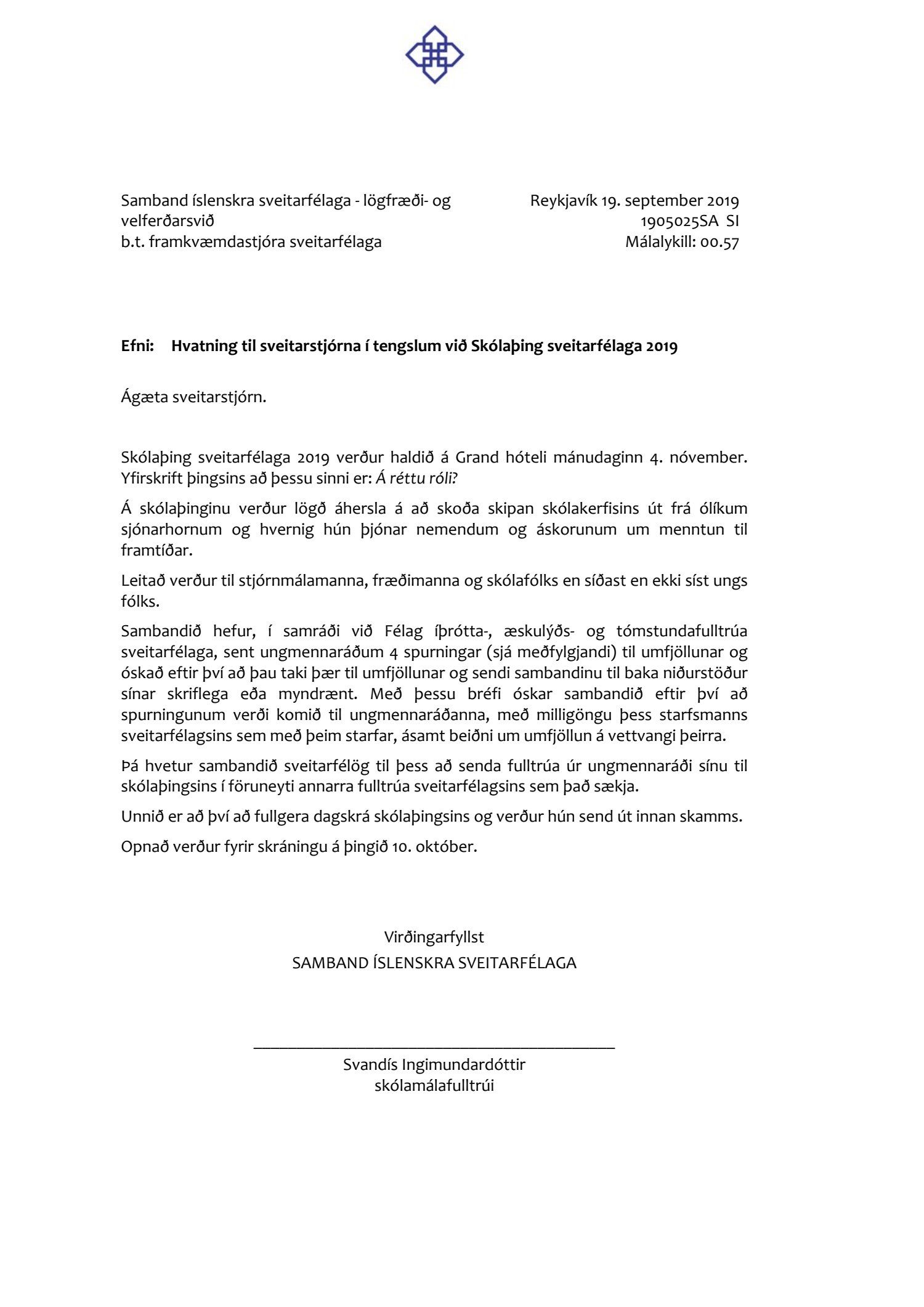 Hvatning frá Sambandi íslenskra sveitarfélaga, dags. 8. október í tengslum við skólaþing 2019.