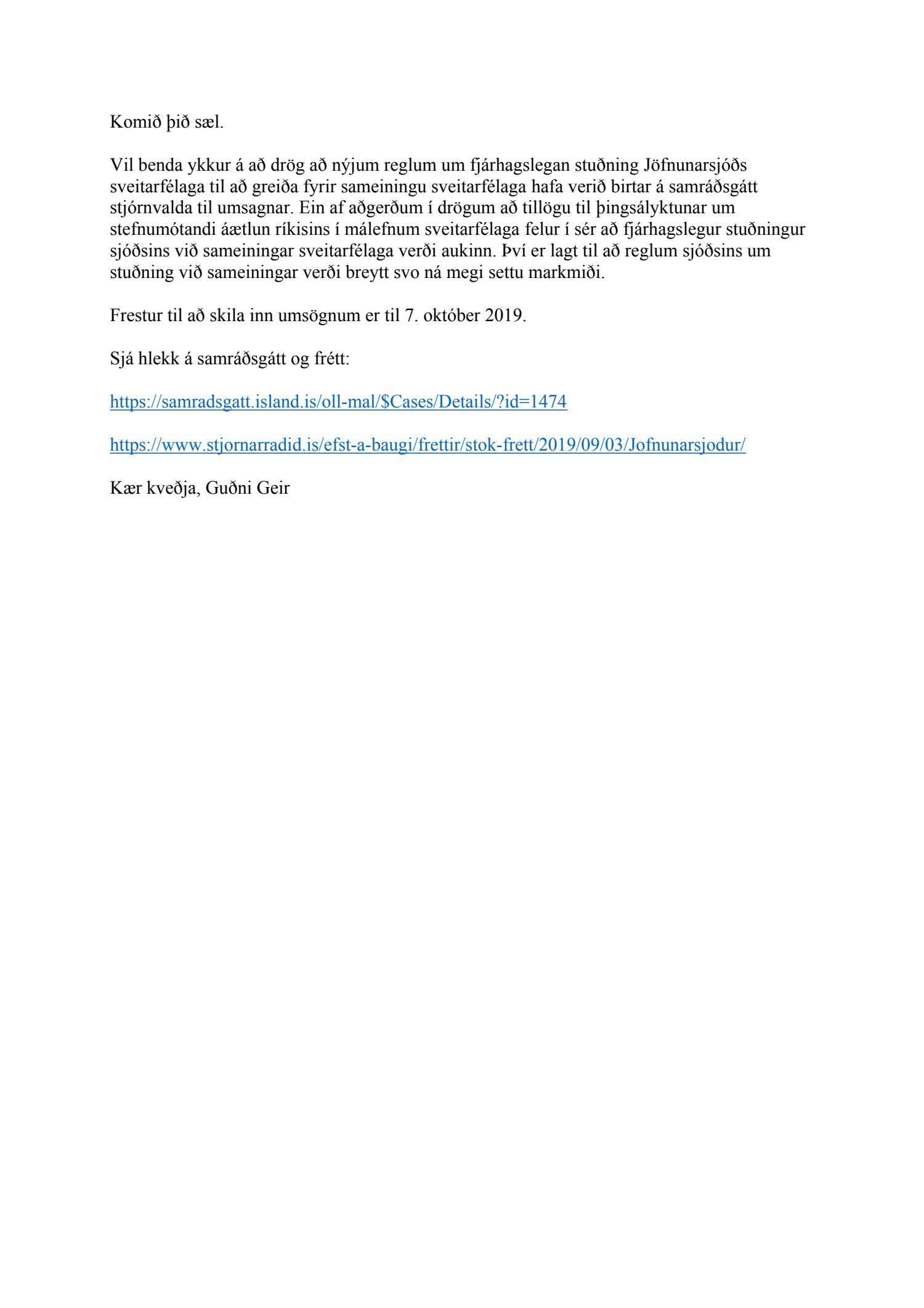 Beiðni frá Jöfnunarsjóði sveitarfélaga um umsögn um nýjar reglur um fjárhagslegan stuðning Jöfnunarsjóðs sveitarfélaga til að greiða fyrir sameiningu sveitarfélaga. Frestur til að skila inn umsögn er til 7. október.
