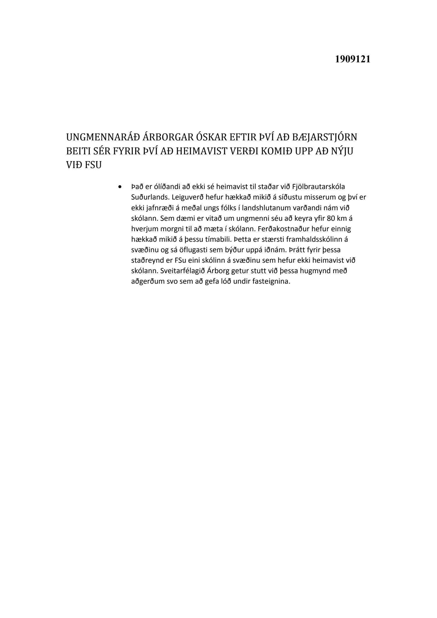 Bæjarráð tekur undir með Ungmennaráði að mikilvægt sé að komið verði upp heimavist á Selfossi. Brýn nauðsyn er til þess að á Selfossi sé heimavist þannig að FSU geti með góðu móti þjónað ungu fólki á Suðurlandi.