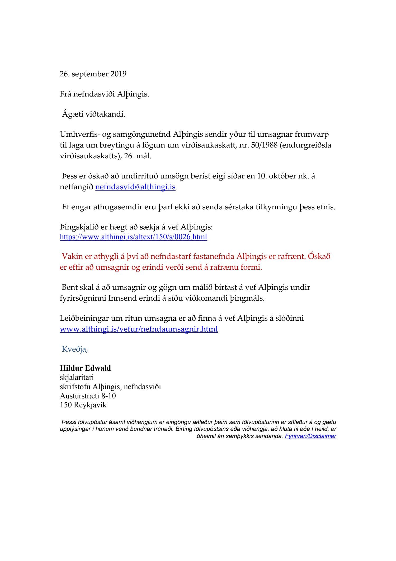 Erindi frá nefndarsviði Alþingis, dags. 26. september, þar sem óskað er eftir umsögn um frumvarp til laga um breytingu á lögum um virðisaukaskatt, nr. 50/1988 (endurgreiðsla virðisaukaskatts), 26. mál.