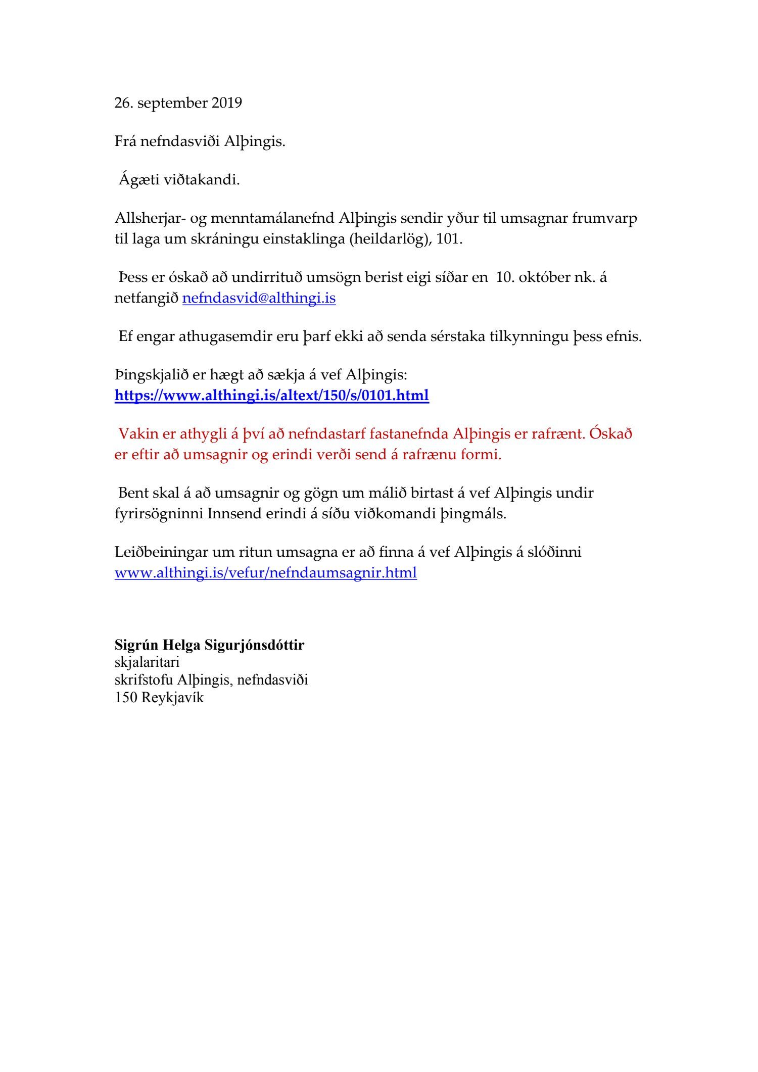 Erindi frá allsherjar- og menntamálanefnd Alþingis, dags. 26. september, þar sem óskað er eftir umsögn um frumvarp til laga um skráningu einstaklinga (heildarlög), 101.