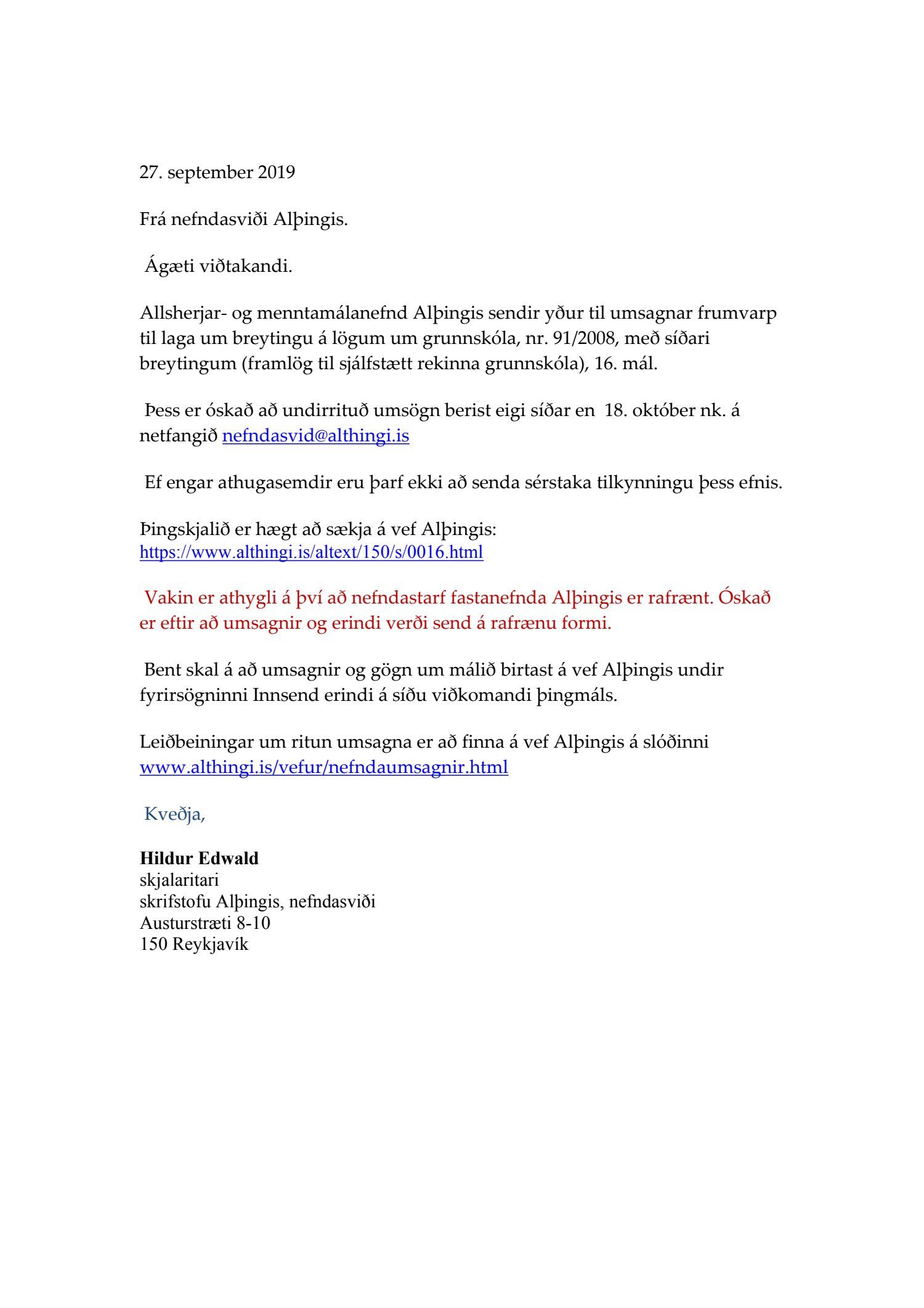 Erindi frá allsherjar- og menntamálanefnd Alþingis, dags. 27. september, þar sem óskað er eftir umsögn um frumvarp til laga um breytingu á lögum um grunnskóla, nr. 91/2008, með síðari breytingum (framlög til sjálfstætt rekinna grunnskóla)