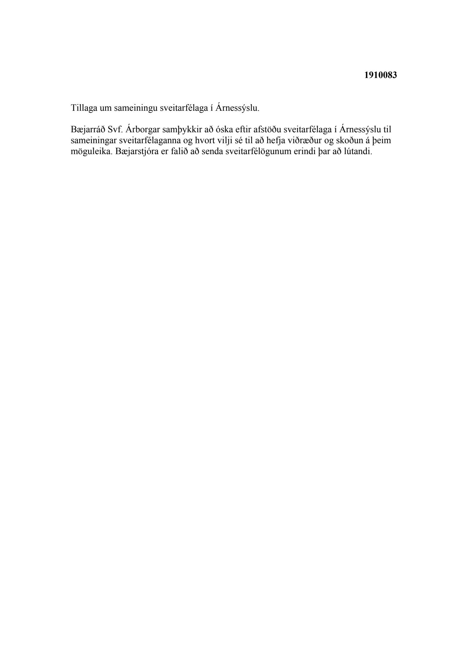 Bæjarráð Svf. Árborgar samþykkir að óska eftir afstöðu sveitarfélaga í Árnessýslu til sameiningar sveitarfélaganna og hvort vilji sé til að hefja viðræður og skoðun á þeim möguleika. Bæjarstjóra er falið að senda sveitarfélögunum erindi þar að lútandi.