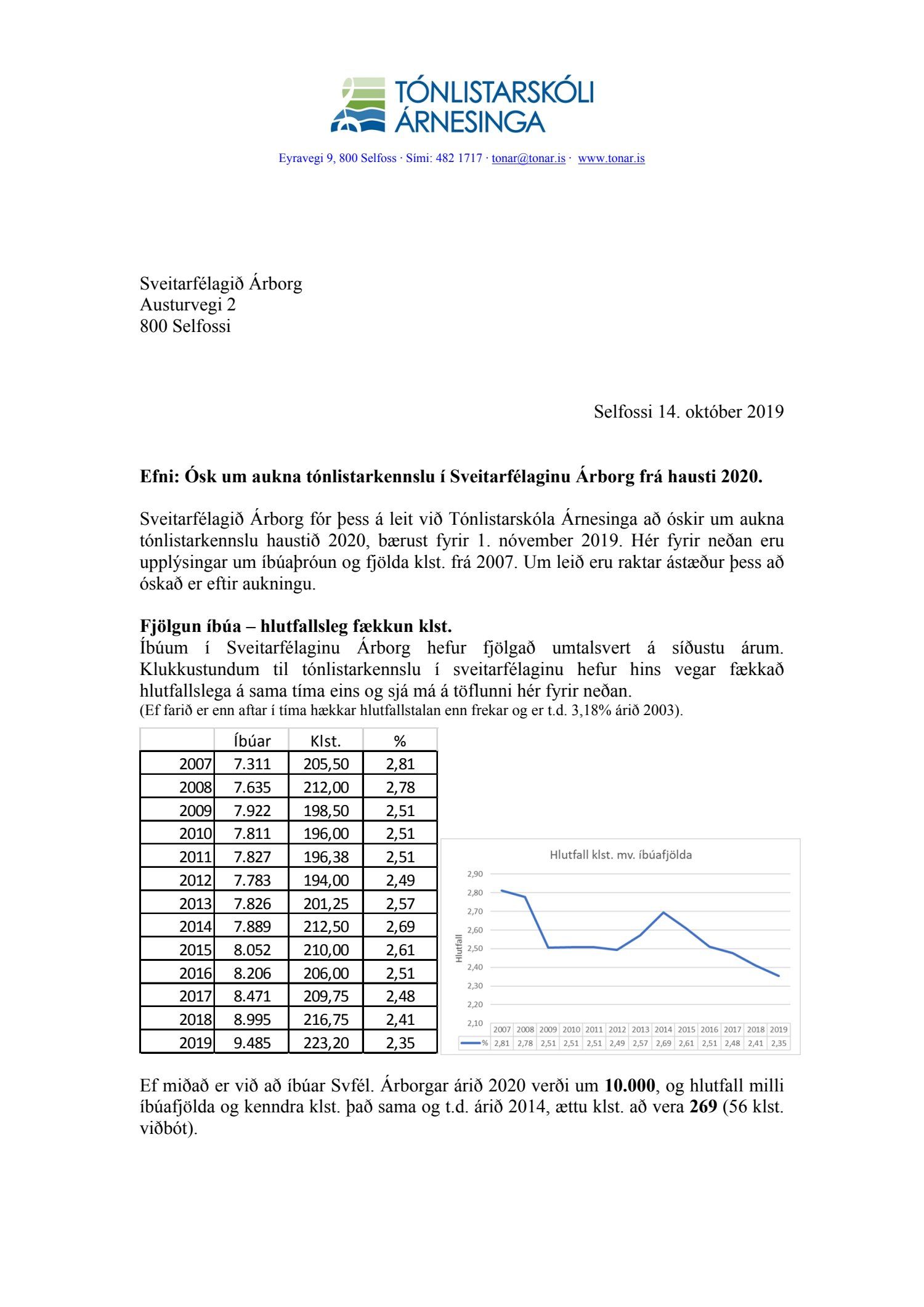 Erindi frá Tónlistarskóla Árnesinga, dags. 14. október, þar sem óskað er um 15-20 tíma aukningu á kennslukvóta í Sveitarfélaginu Árborg frá hausti 2020.