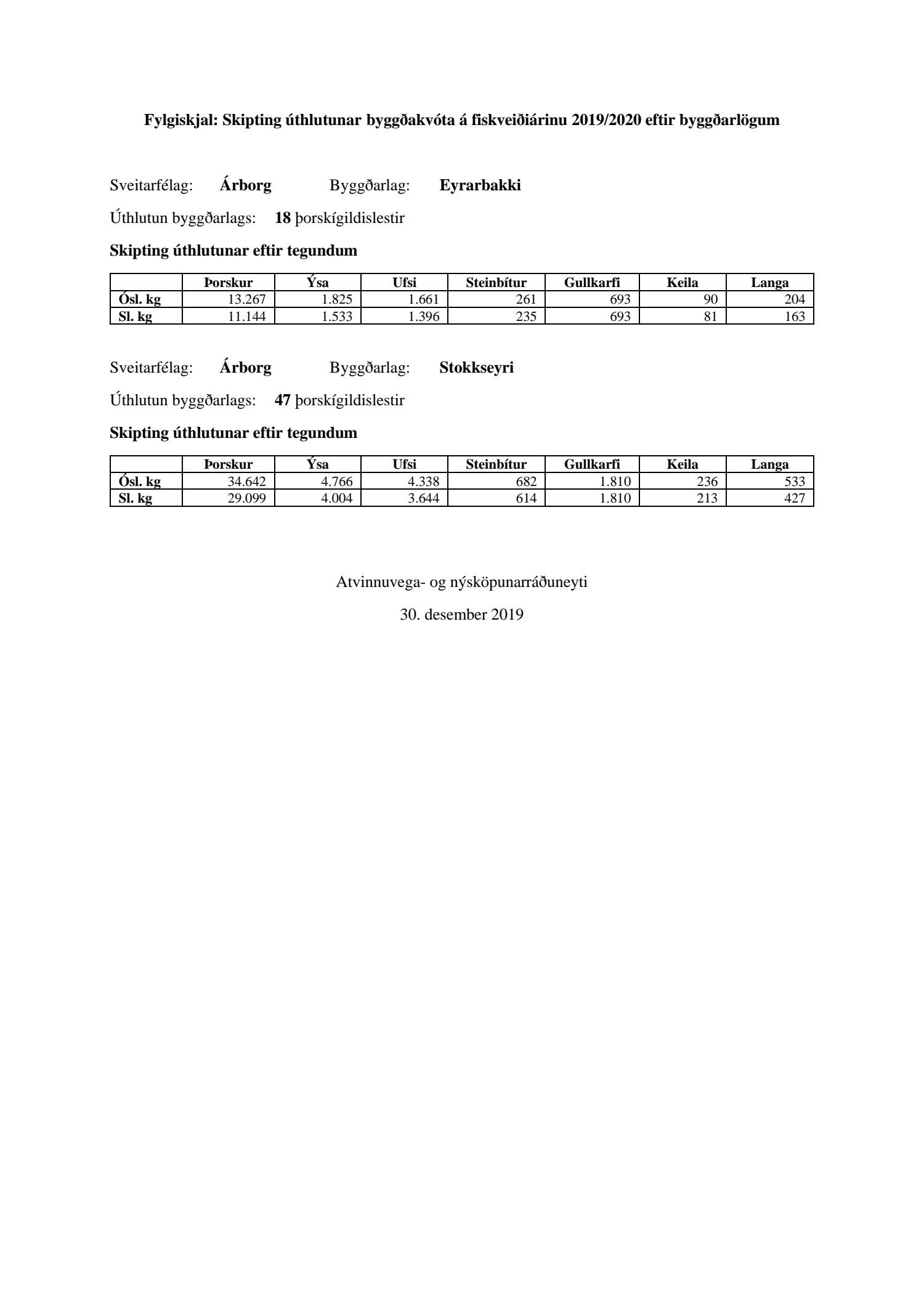 Skipting úthlutunar byggðakvóta 2019/2020. Einnig eru lagðar fram þær sérreglur sem Svf. Árborg samþykkti fyrir liðið kvótaár.