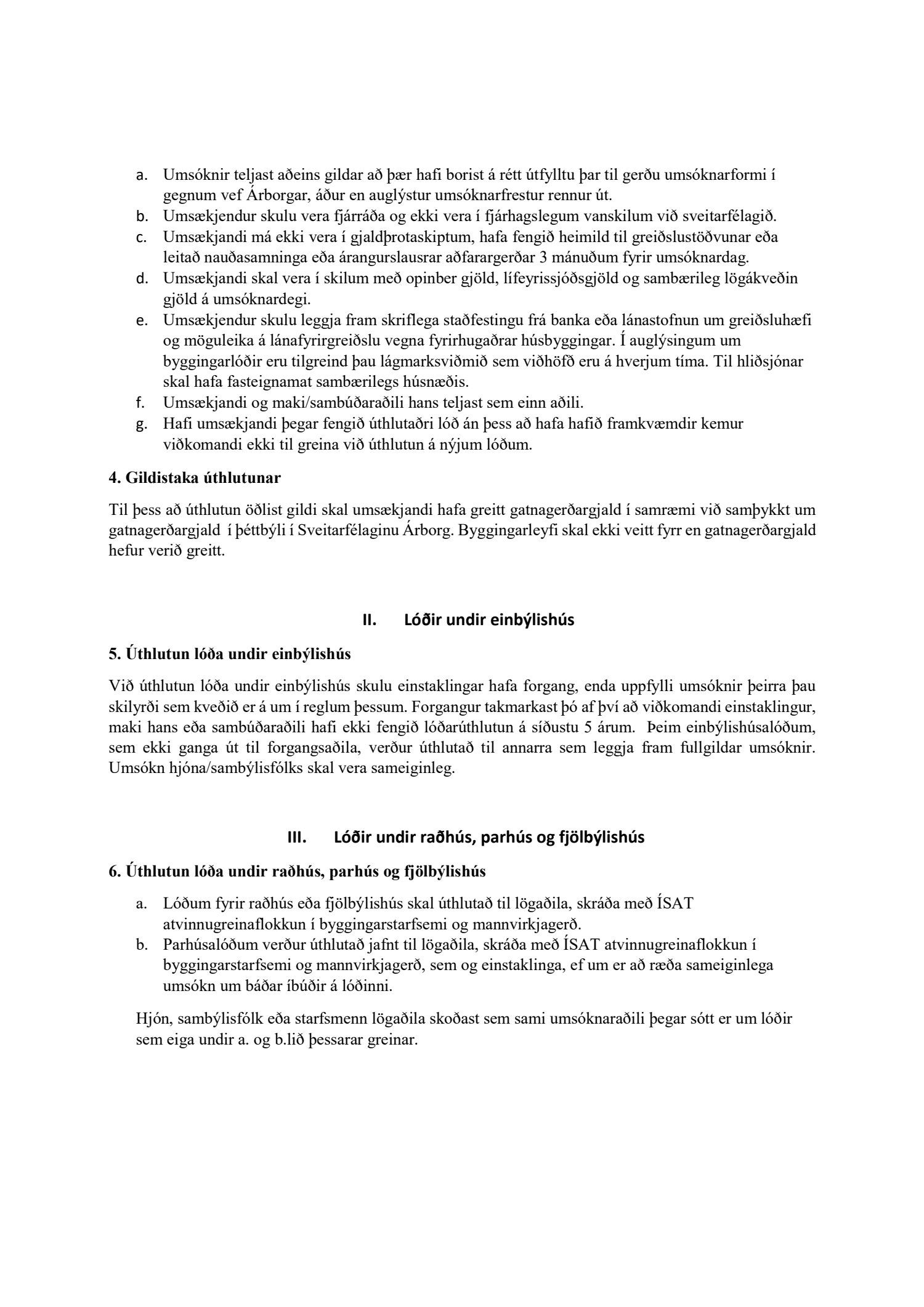 Í 6. gr. (Lóðir undir raðhús, parhús og fjölbýlishús) eru orðin "að jafnaði" tekin út í a. lið. Þá er kveðið á um það að lögaðilar með ÍSAT atvinnugreinaskráningu eigi jafnan rétt og einstaklingar á að sækja um parhús. Í 2. mgr. 6. gr. er bætt við að hjón, sambýlisfólk eða starfsmenn lögaðila skoðist sem sami umsóknaraðilinn þegar sótt er um lóðir skv. a. og b. lið.