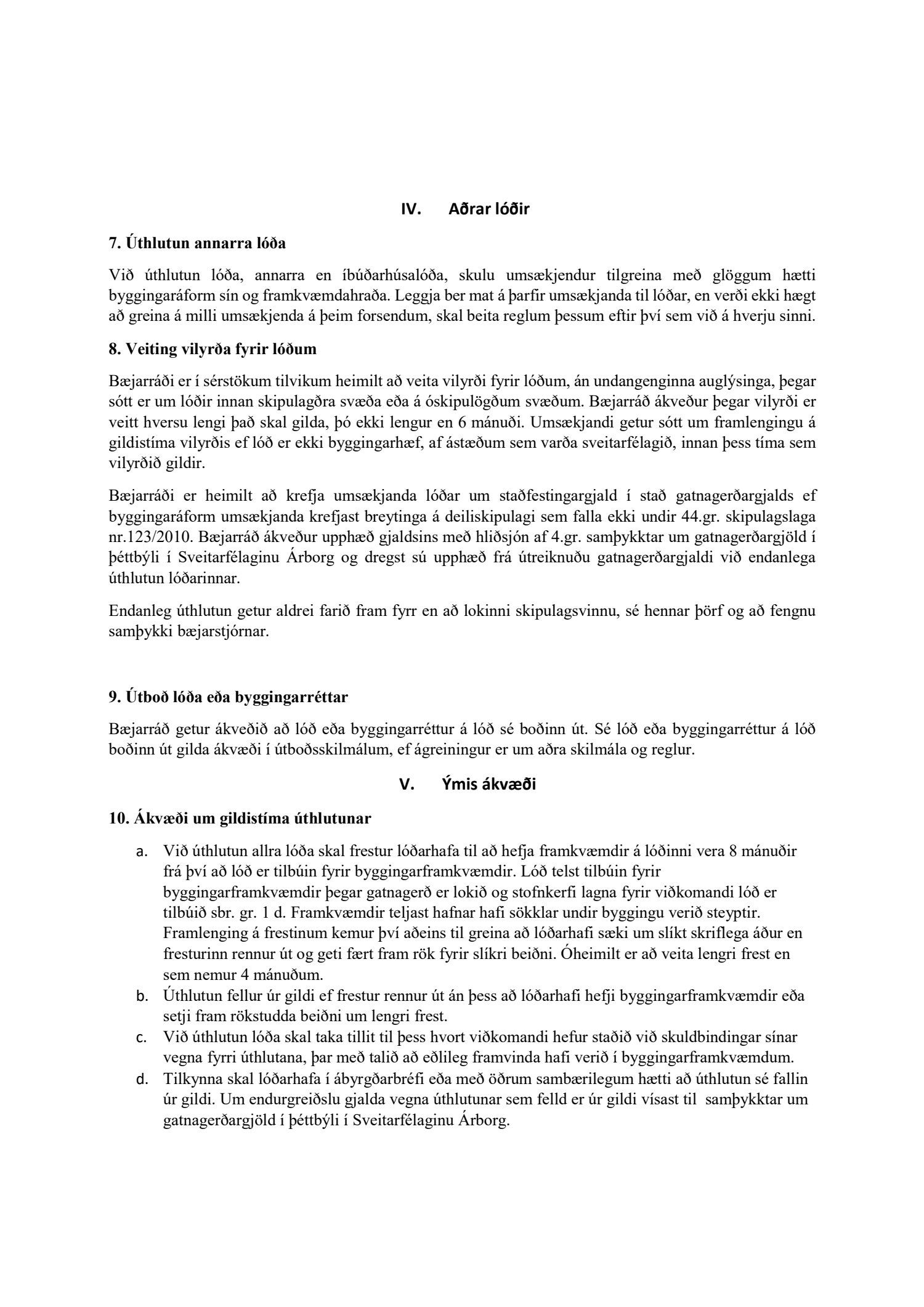 Í 10. gr. segir að við úthlutun allra lóða, ekki bara íbúðarlóða skuli frestur til að hefja framkvæmdir vera 8 mánuðir.