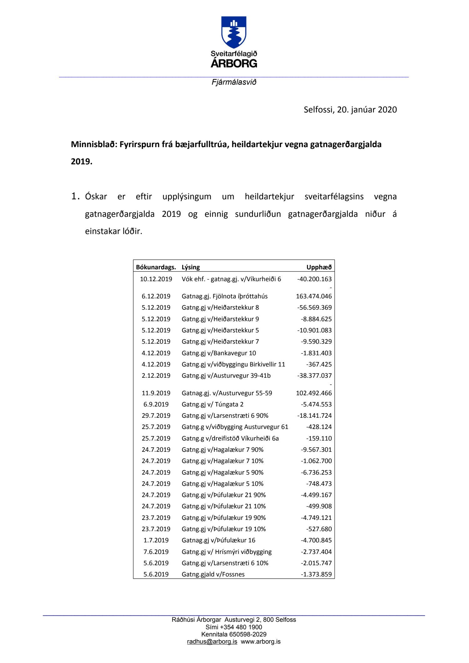 Beiðni frá Gunnari Egilssyni, bæjarfulltrúa D-lista, þar sem óskað er eftir upplýsingum um heildartekjur sveitarfélagsins vegna gatnagerðargjalda 2019 og einnig sundurliðun gatnagerðargjalda niður á einstakar lóðir.
