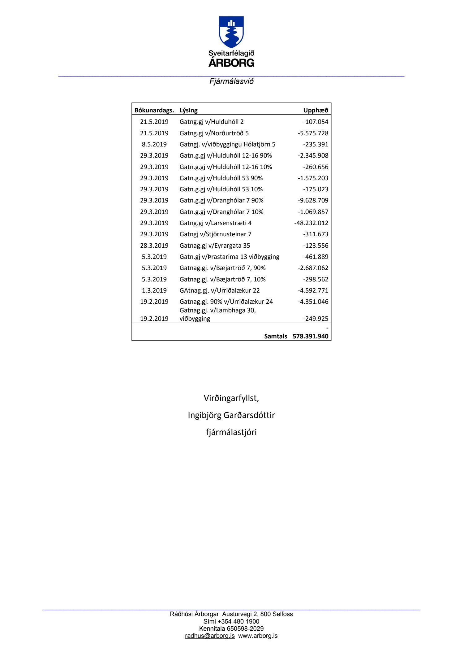 Heildartekjur vegna gatnagerðargjalda 2019 ásamt sundurliðun gatnagerðargjalda á einstakar lóðir lagðar fram. Samanlagðar heildartekjur sveitarfélagsins vegna gatnagerðagjalda árið 2019 voru kr. 578.391.940.