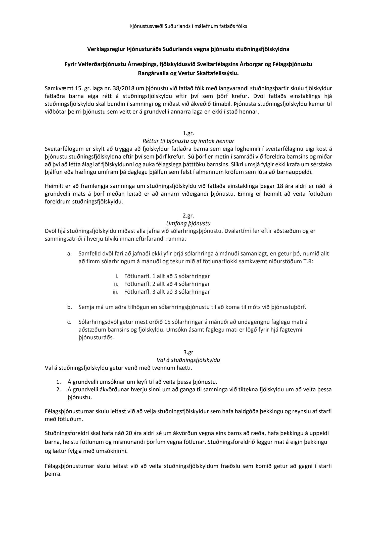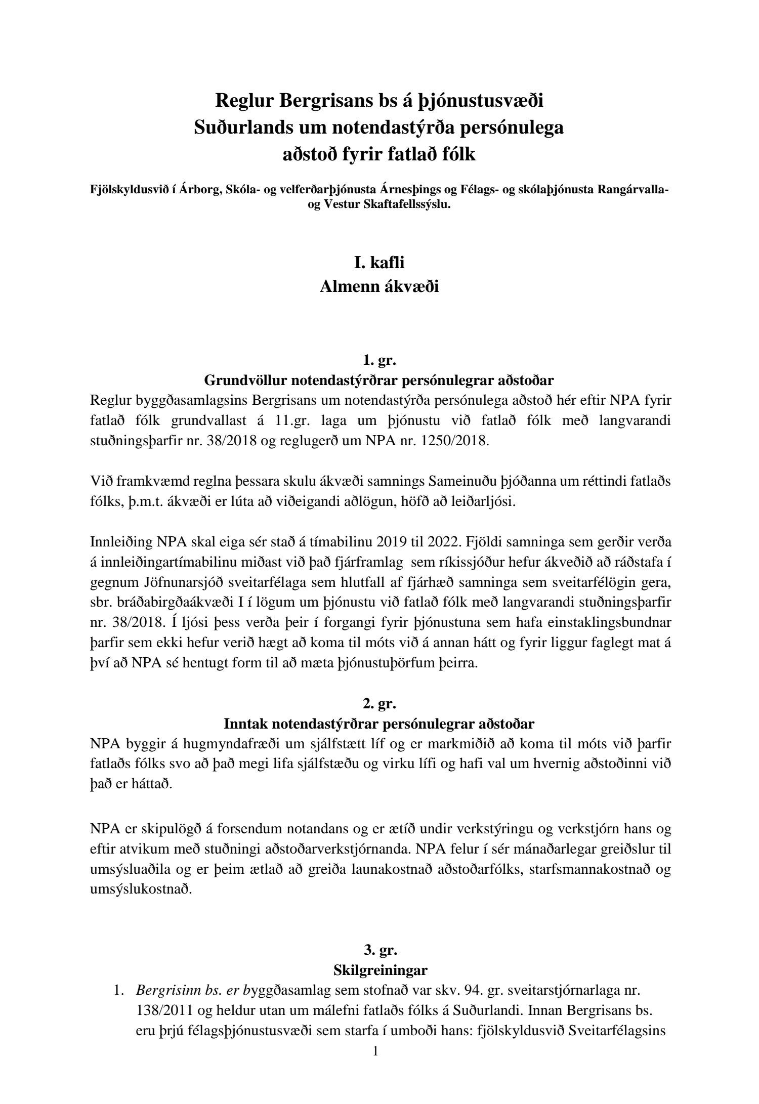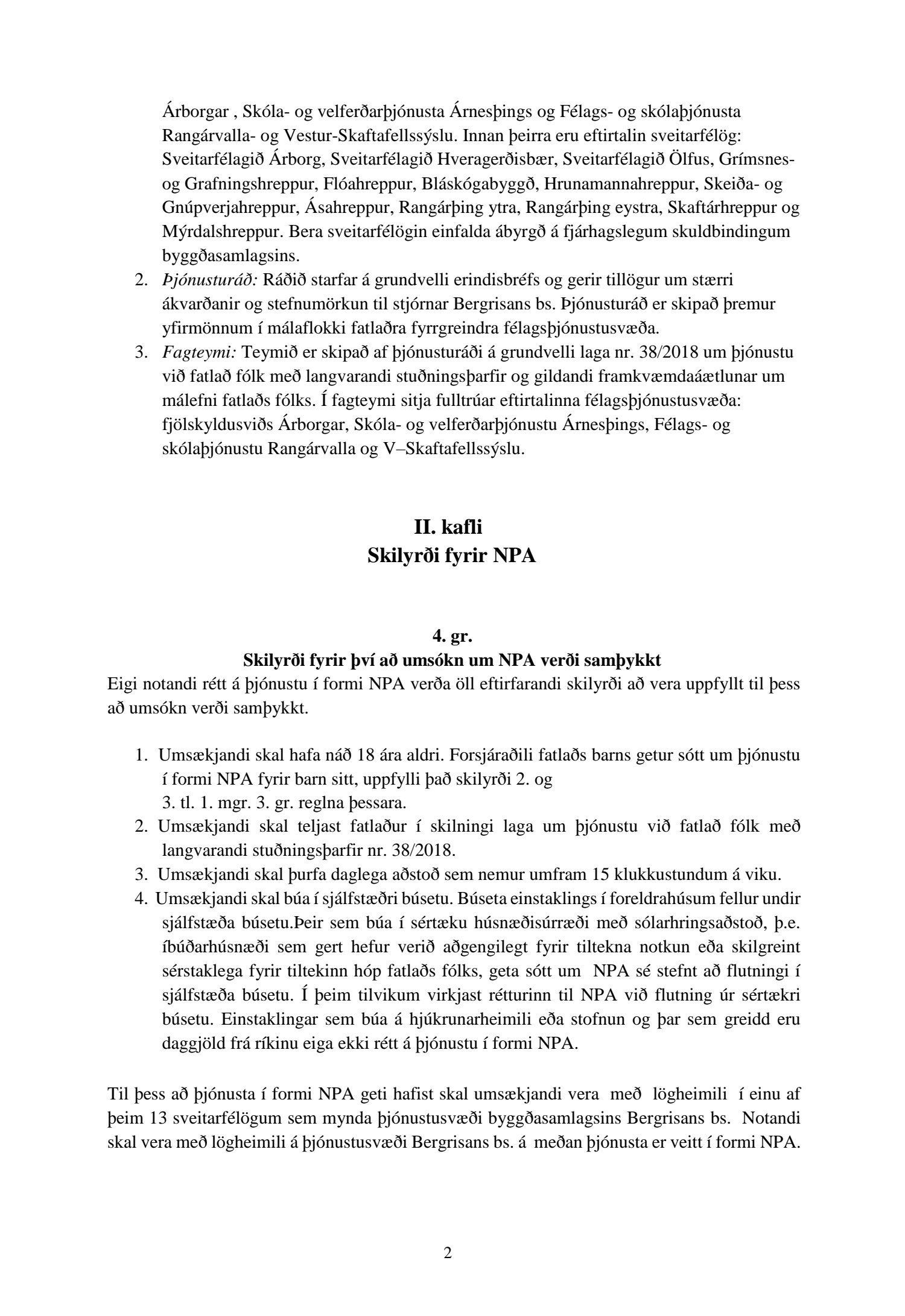 -liður 4. Verklagsreglur um stuðningsfjölskyldur og reglur um NPA. Stjórn Bergrisans samþykkir reglurnar fyrir sitt leyti. Óskað er eftir staðfestingu aðildarsveitarfélaganna á reglunum.
