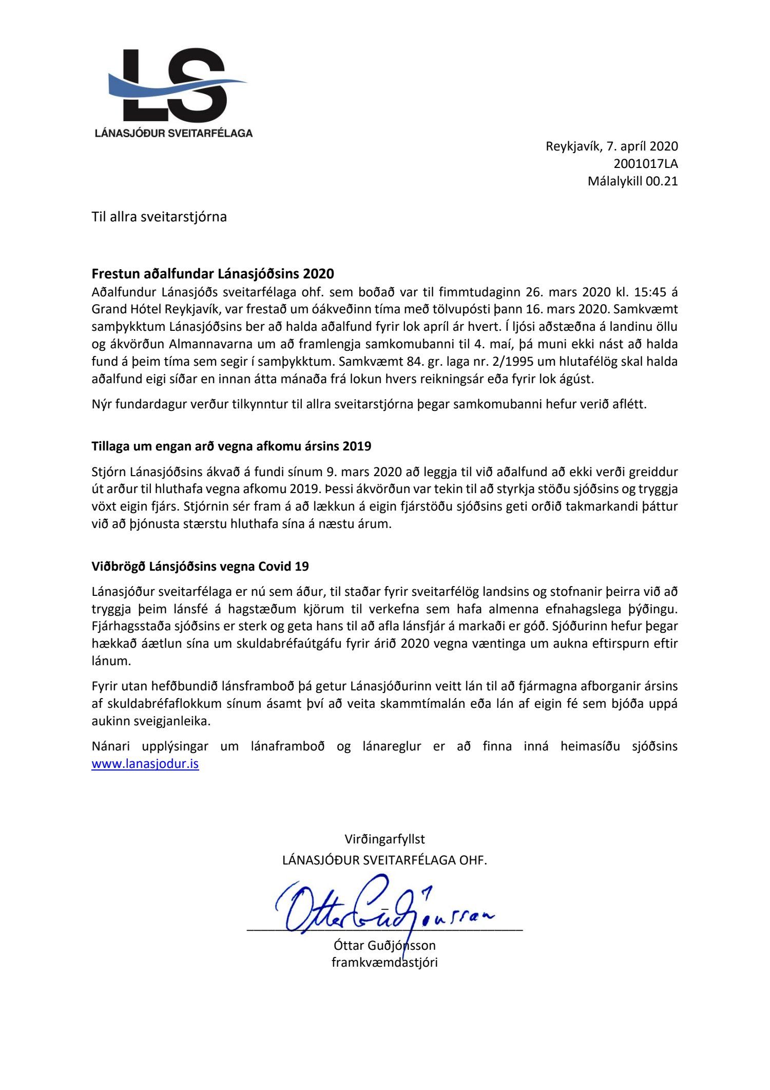 Erindi frá Lánasjóði sveitarfélaga ohf, dags. 7. apríl, þar sem fram kemur að nýr fundardagur aðalfundar Lánasjóðsins 2020 verði tilkynntur til allra sveitarstjórna þegar að samkomubanni hefur verið aflétt. Einnig er lögð fram tillaga sem leggja á til á aðalfundi, um að ekki verði greiddur út arður til hluthafa vegna afkomu 2019.