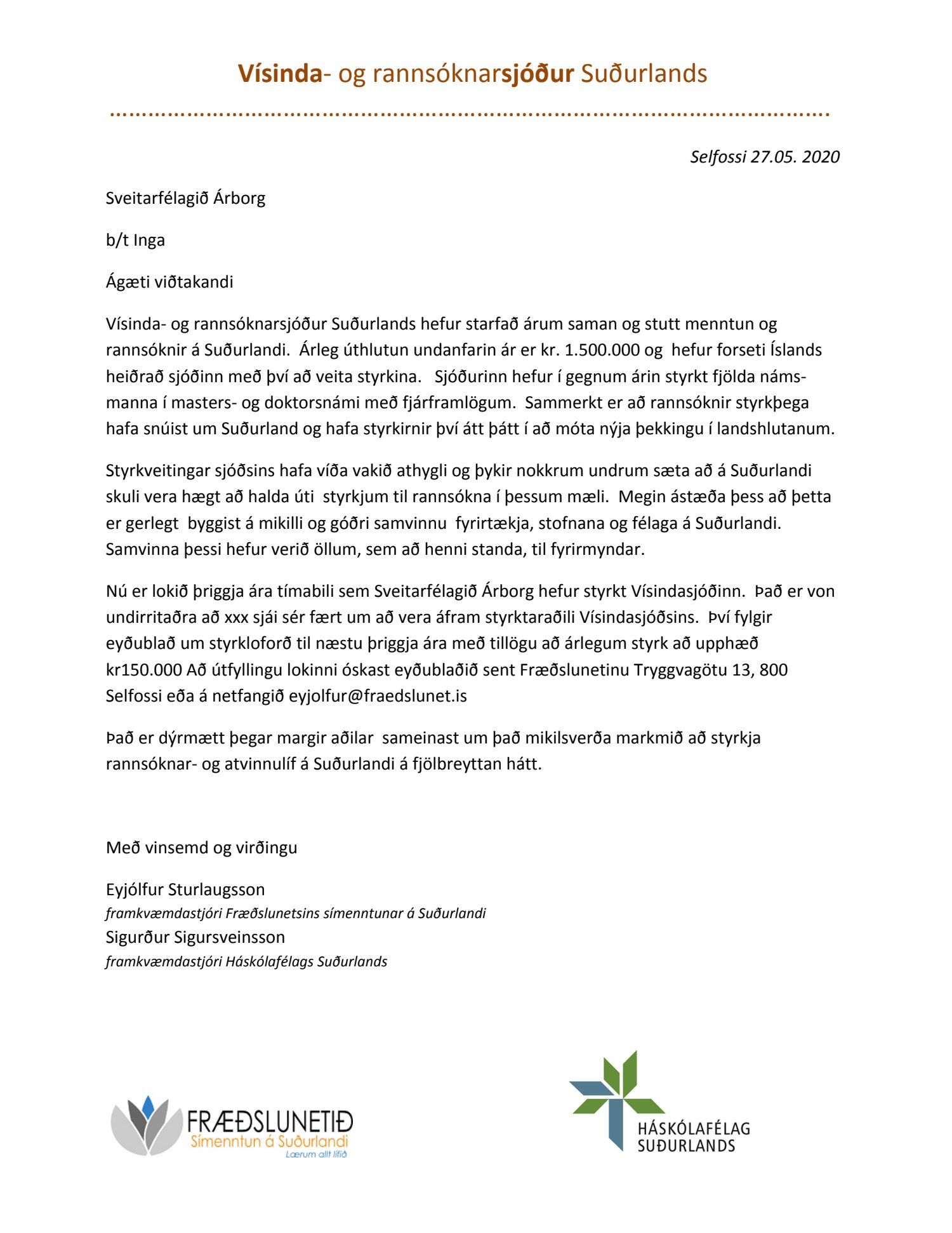 Beiðni frá vísinda- og rannsóknasjóðs Suðurlands, dags. 27. maí, þar sem óskað er eftir áframhaldandi að sveitarfélagið verði áfram styrktaraðili Vísindasjóðsins.