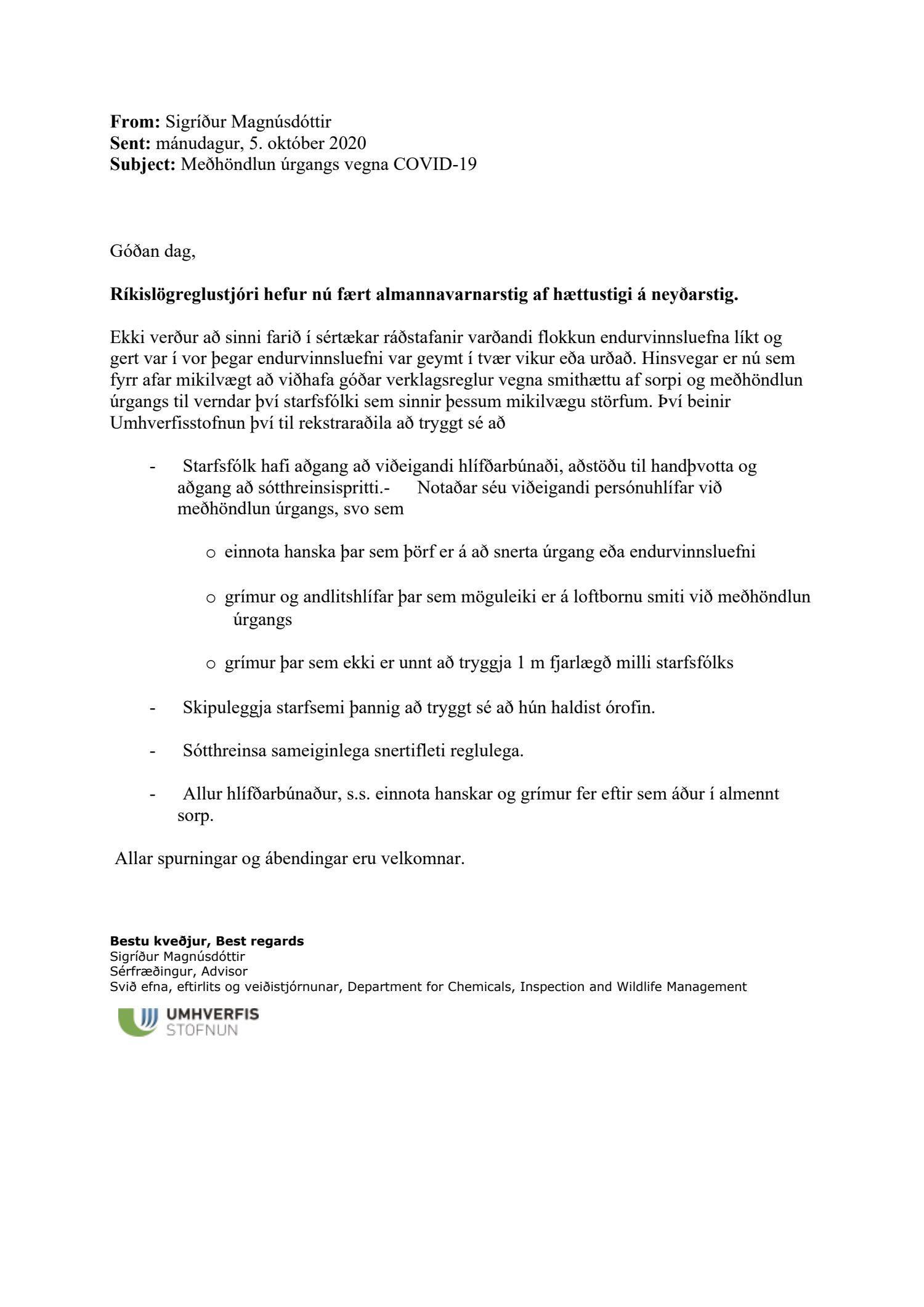 Erindi frá Umhverfisstofnun, dags. 5. október, þar sem fram komu upplýsingar um meðhöndlun úrgangs vegna Covid-19, þar sem ríkislögreglustjóri hefur nú fært almannavarnarstig af hættustigi yfir á neyðarstig.