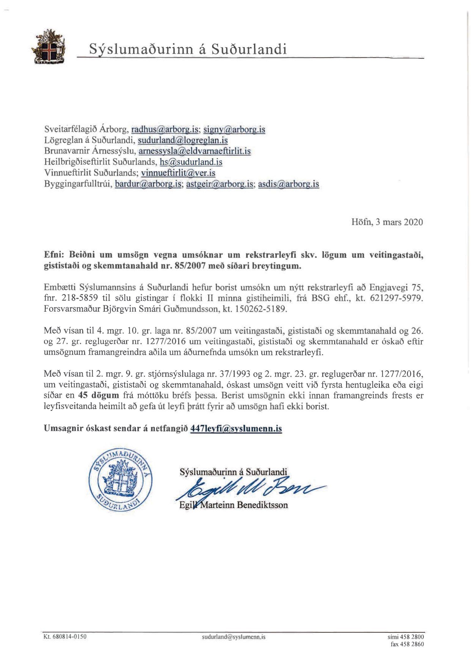 Beiðni frá Sýslumanninum á Suðurlandi, dags. 3. mars þar sem óskað er eftir umsögn um rekstrarleyfi til sölu gistingar í flokki II minna gistiheimili að Engjavegi 75. Umsækjandi BSG ehf.