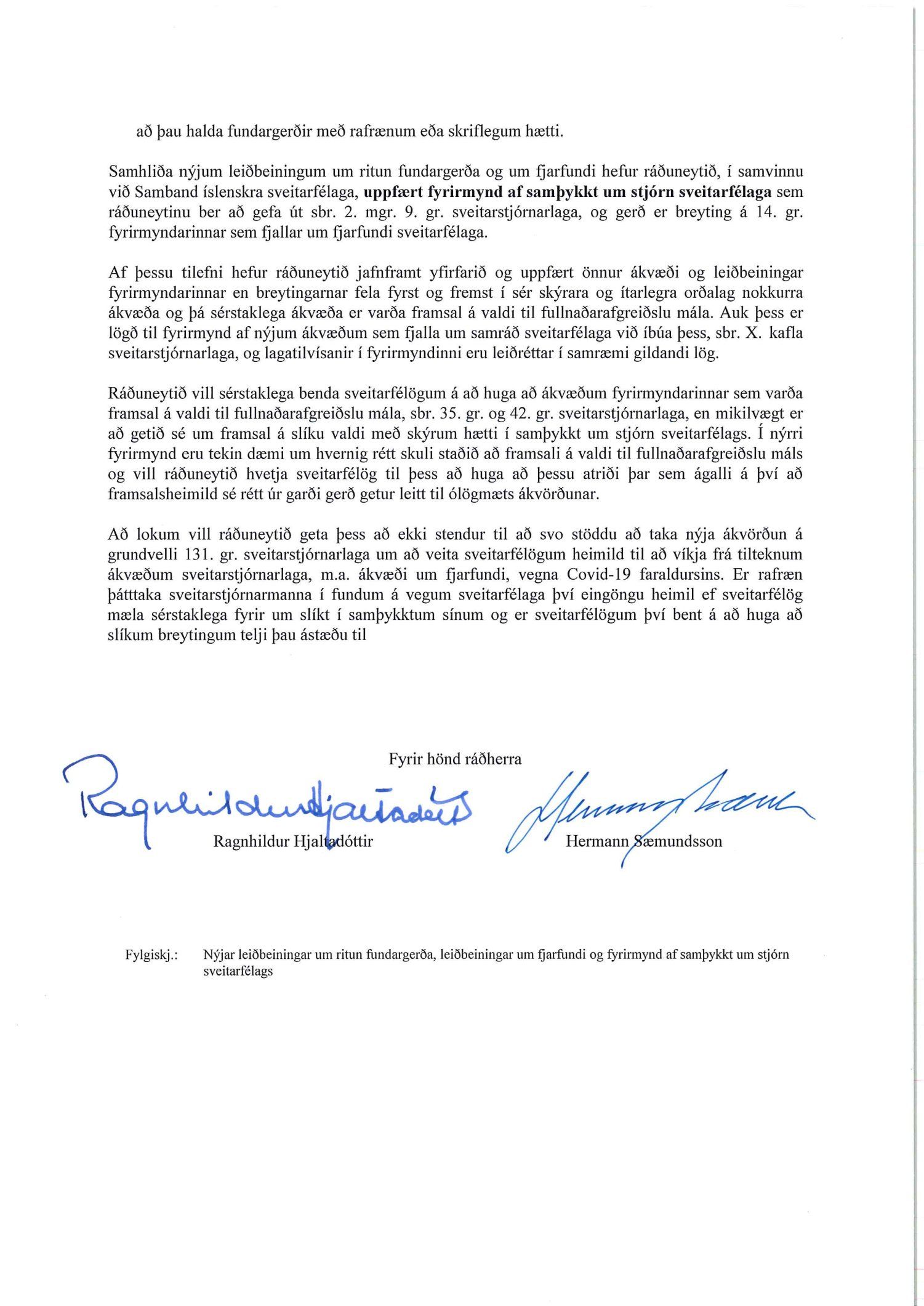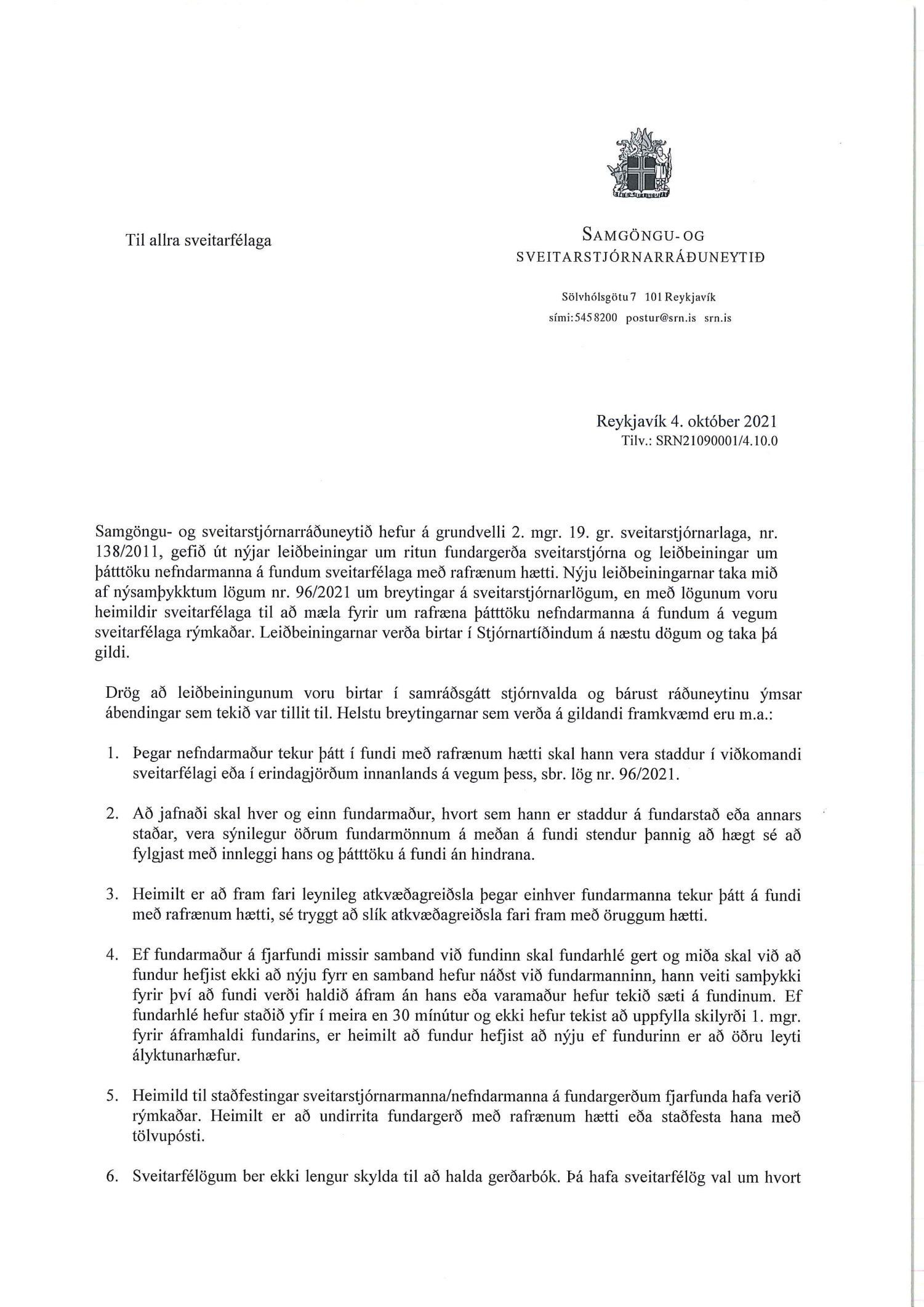 Erindi frá samgöngu- og sveitarstjórnarráðuneytinu, dags. 4. október, vegna nýrra leiðbeininga um ritun fundargerða sveitarstjórnar og leiðbeiningar um þátttöku nefndarmanna á fundum sveitarfélaga með rafrænum hætti.