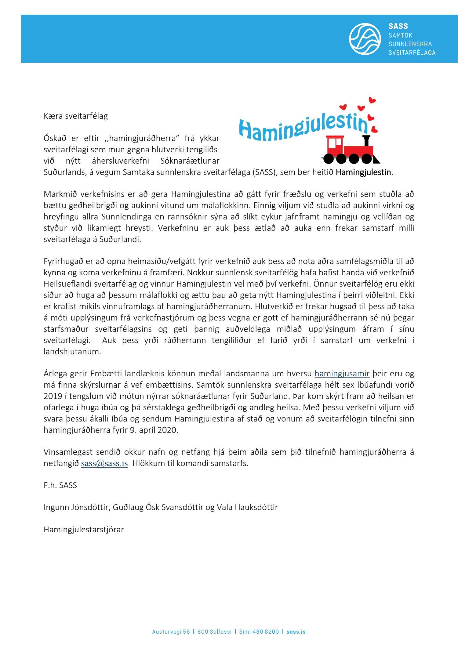 Erindi frá SASS, dags. 18. mars, þar sem kynnt er nýtt verkefni sóknaráætlunar sem nefnist hamingjulestin. Markmið verkefnisins er að stuðla að bættu geðheilbrigði og aukinni vitund um málaflokkinn. Óskað er eftir ,,hamingjuráðherra,, frá sveitarfélaginu sem mun gegna hlutverki tengiliðs við nýtt áhersluverkefni Sóknaráætlunar Suðurlands.