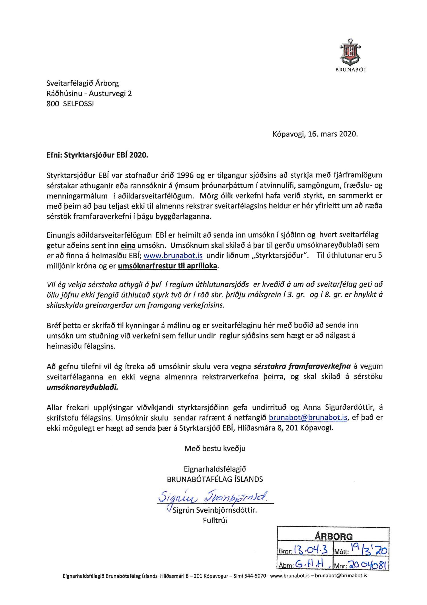 Bréf frá EBÍ, dags. 16. mars, þar sem fram koma upplýsingar um styrktarsjóð EBÍ 2020.