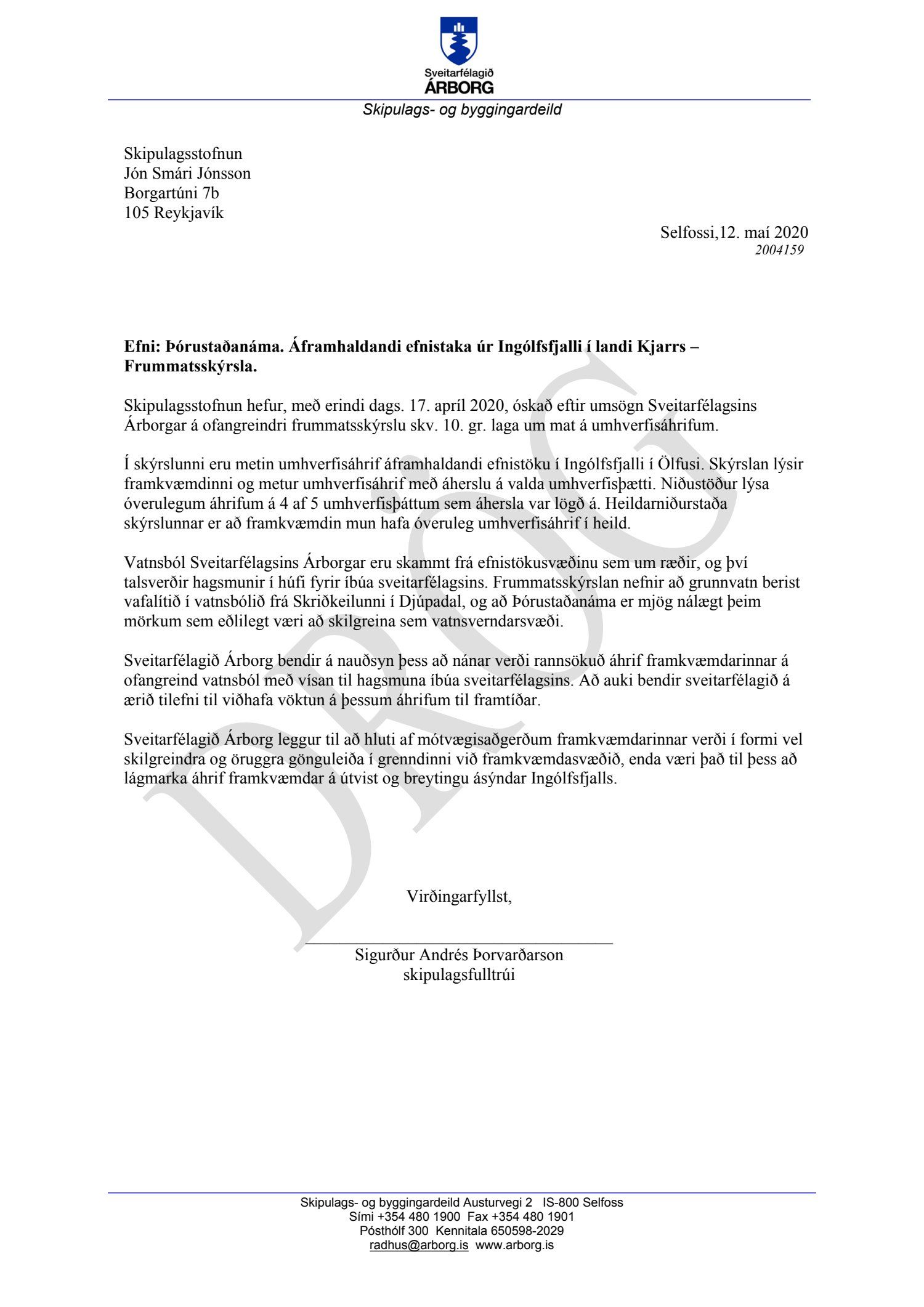 Umsögn Sveitarfélagsins Árborgar, unnin af skipulagsfulltrúa, um frummatsskýrslu, Þórustaðanáma, áframhaldandi efnistaka úr Ingólfsfjalli í landi Kjarrs.