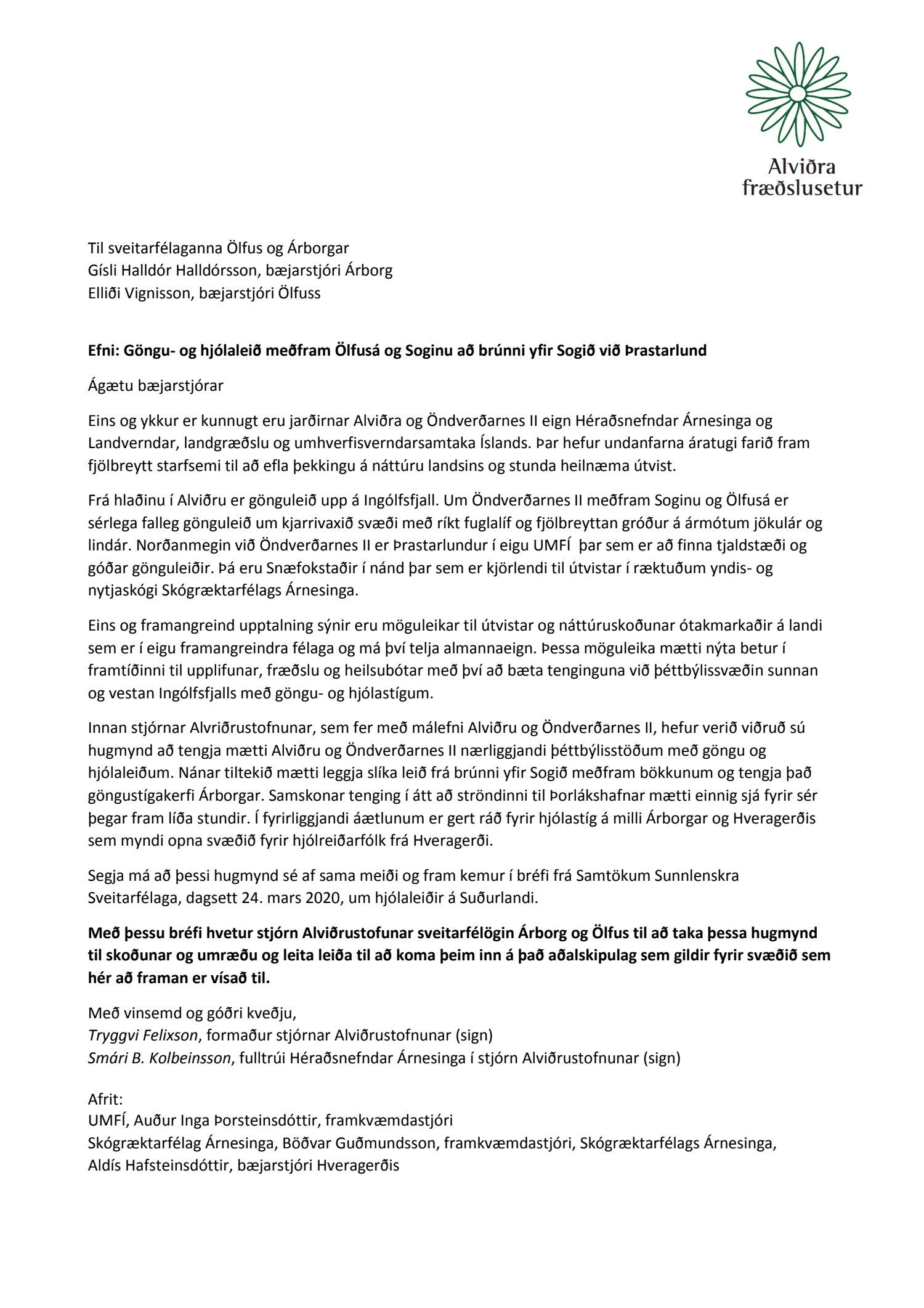 Erindi frá stjórn Alviðrustofnunar, dags. 22. apríl, um að gerð verði göngu- og hjólaleið meðfram Ölfusá og Soginu að brúnni yfir Sogið við Þrastalund. Hvetur stjórn Alviðrustofnunar sveitarfélögin Árborg og Ölfus til að taka þessa hugmynd til skoðunar og umræðu og leita leiða til að koma þeim inn á það aðalskipulag sem gildir fyrir svæðið.