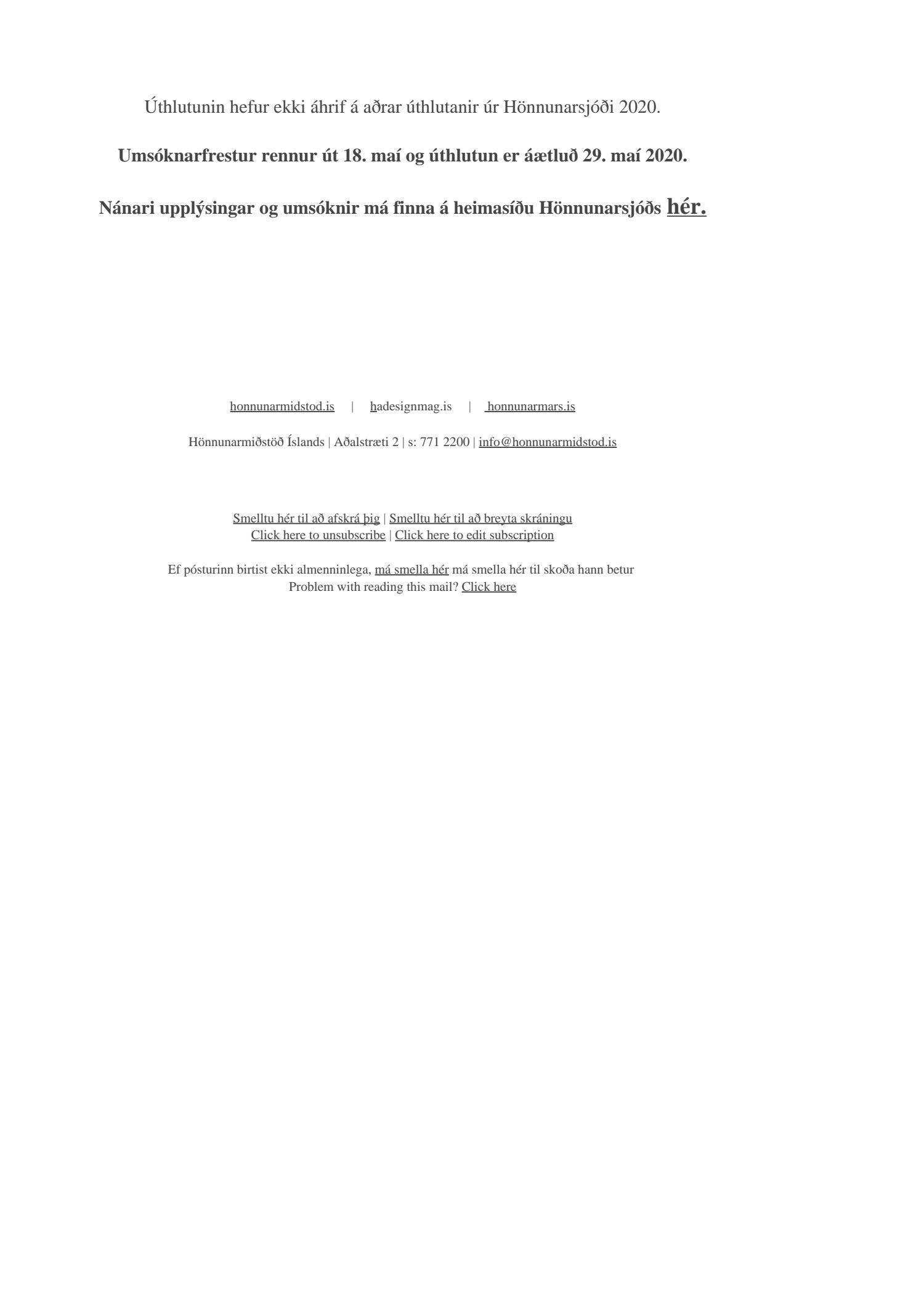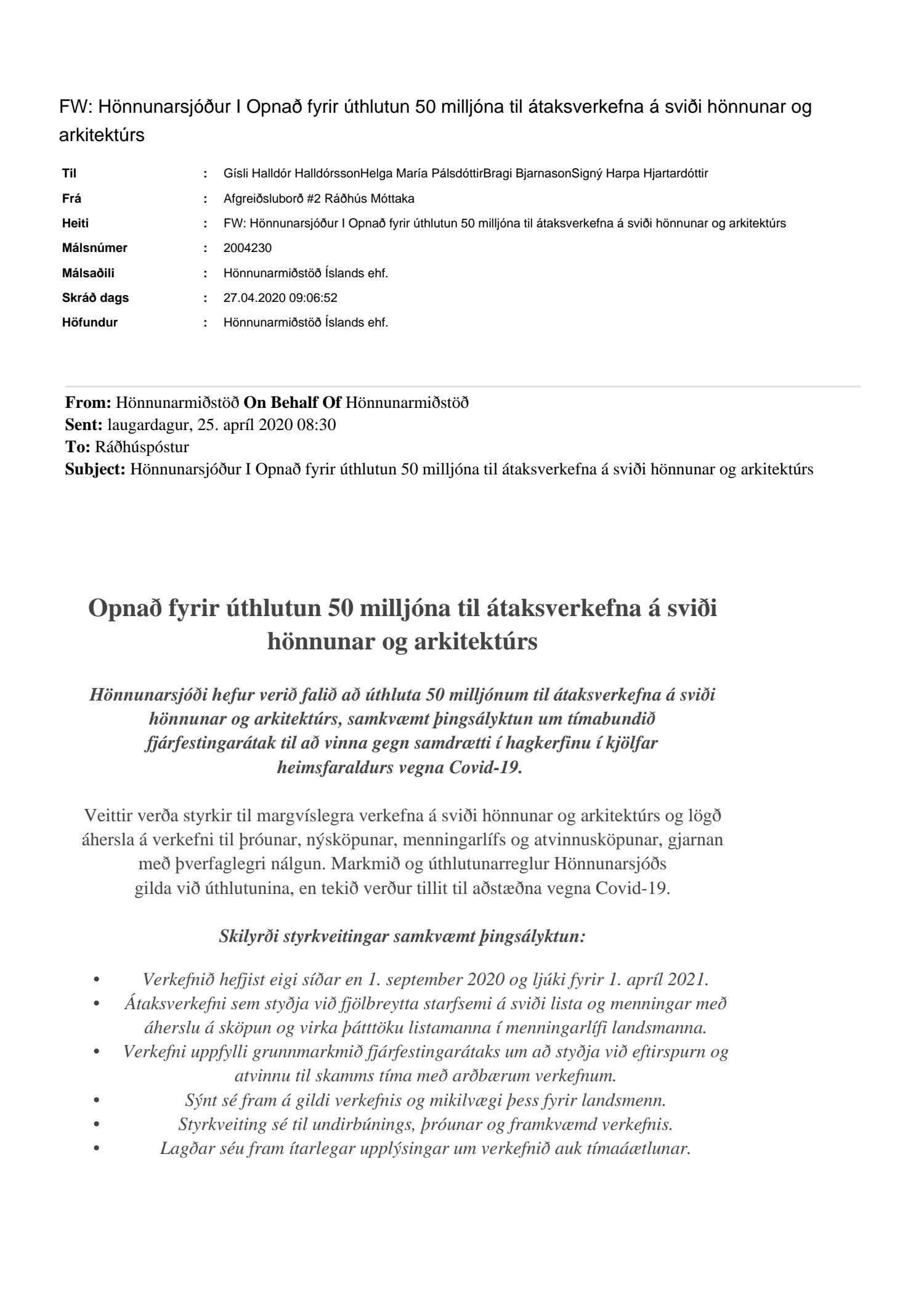 Erindi frá Hönnunarsjóði Íslands, dags. 25. apríl, þar sem fram kemur að opnað hefur verið fyrir úthlutun á 50 milljónum til átaksverkefna á sviði hönnunar og arkitektúrs, samkvæmt þingsályktun um tímabundið fjárfestingarátak til að vinna gegn samdrætti í hagkerfinu í kjölfar heimsfaraldurs vegna Covid-19.